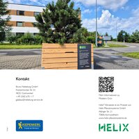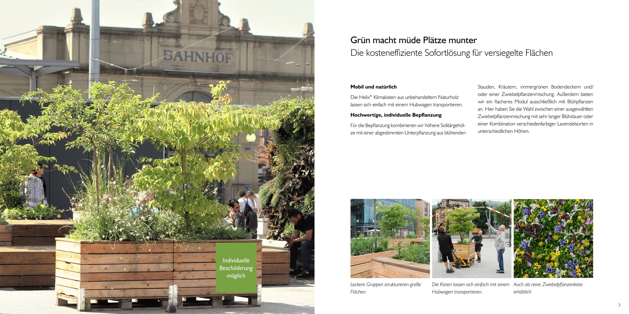 Mit der HELIX® Klimakiste bietet die Bruno Nebelung GmbH ab sofort, unter der national bekannten Marke KIEPENKERL®, eine kosteneffiziente Sofortlösung für versiegelte Flächen. Mobil und natürlich Die HELIX® Klimakisten aus unbehandeltem Naturholz lassen sich einfach mit einem Hubwagen transportieren. Das Naturholz der HELIX® Klimakisten ist FSC- bzw. PEFC-zertifiziert. Sie sind in den Größen 120 x 100 x 80 cm (L x B x H) und 120 x 100 x 60 (L x B x H) verfügbar, welche individuell bepflanzt werden können.