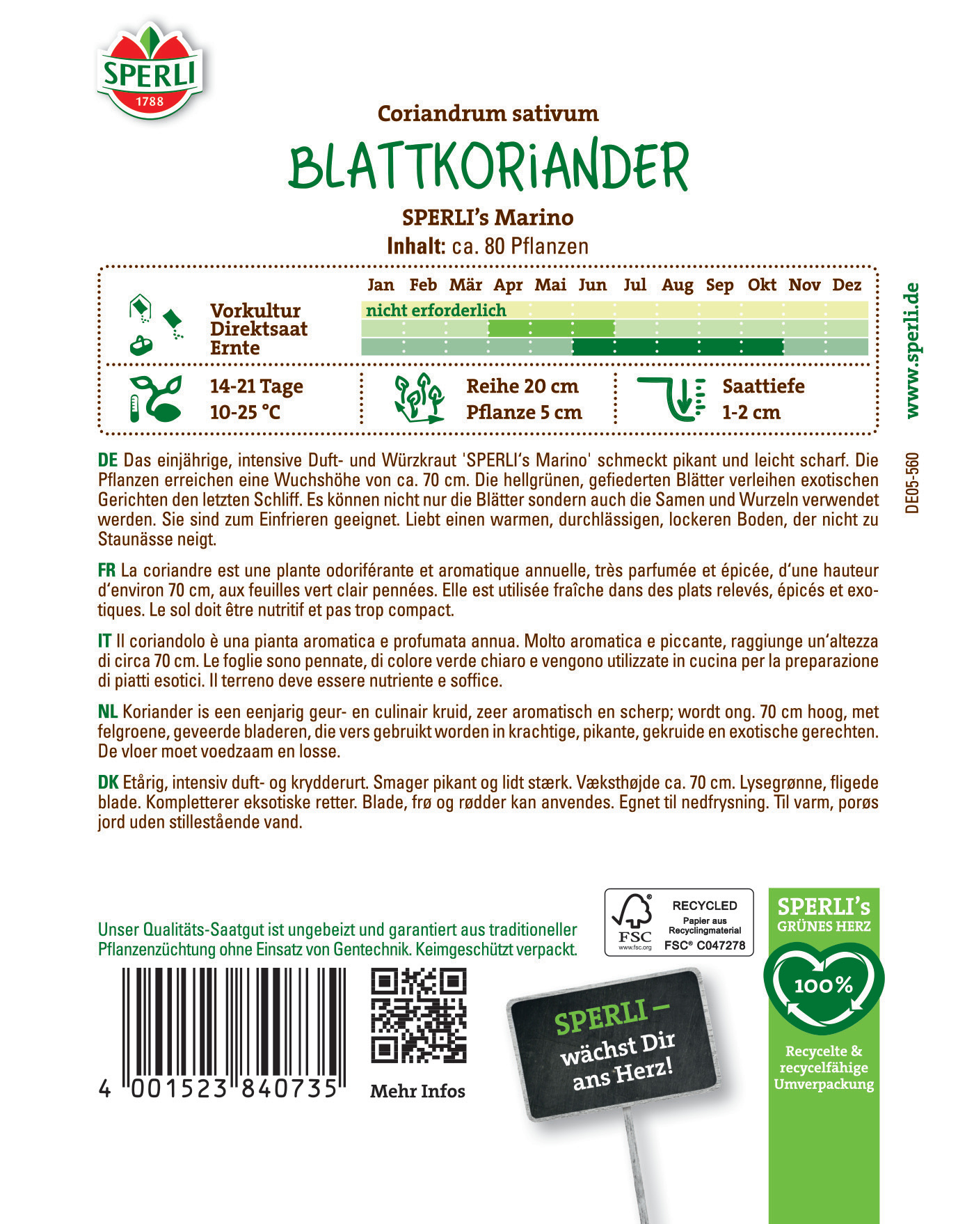 Koriander ist ein einjähriges Duft- und Würzkraut, sehr aromatisch und scharf, wird etwa 70 cm hoch, mit hellgrünen, gefiederten Blättern, das frisch in kräftigen, pikanten, würzigen und exotischen Gerichten Verwendung findet. Der Boden muss nährstoffreich und locker sein.| Kurzbezeichnung : | Koriander SPERLI's Marino |