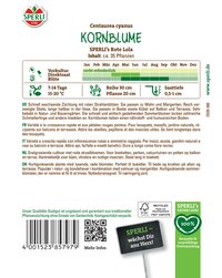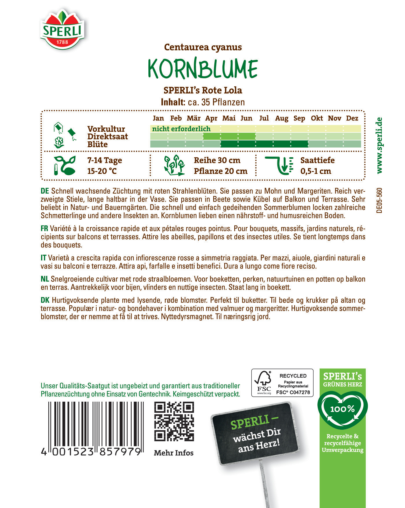Die Kornblume erinnert an sommerliche Idylle zu Grossmutters Zeiten. Diese attraktive Züchtung mit ihren roten Strahlenblüten verleiht jedem Bauernstrauss eine bezaubernde Note. Die Kornblume liebt vollsonnige Plätze und bevorzugt einen leichten, durchlässigen Boden. Sie gedeiht zuverlässig auf Gartenbeeten und in Naturgärten, schon 2 - 3 Monate nach der Aussaat erscheinen die Blüten.| Kurzbezeichnung : | Kornblume SPERLI's Rote Lola |