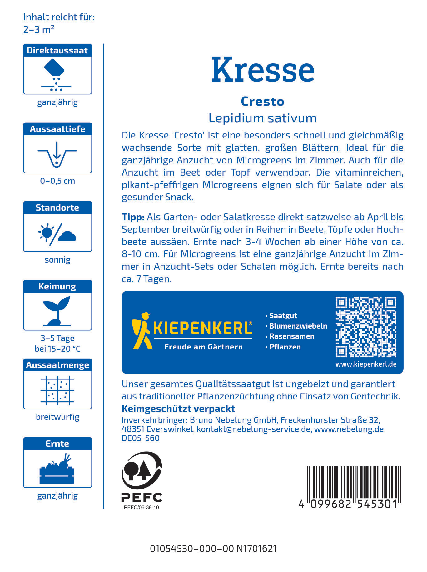 Die Kresse 'Cresto' zeichnet sich durch ihr schnelles und gleichmäßiges Wachstum aus und liefert glatte, große Blätter. Diese Sorte ist ideal für die ganzjährige Anzucht von Microgreens im Zimmer und lässt sich sowohl im Beet als auch in Töpfen anbauen. Ihre pflanzenreichen, pikant-pfeffrigen Blätter sind nicht nur gesund, sondern auch perfekt für Salate oder als Snack. Mit ihrer unkomplizierten Anzucht können Sie schnell frische, gesunde Zutaten für Ihre Küche gewinnen. Die Kresse bringt nicht nur Geschmack, sondern auch eine aufregende Farbe auf den Tisch und eignet sich ideal für kreative Gerichte. Genießen Sie die Vielseitigkeit der Kresse und bereichern Sie Ihre Ernährung auf einfache Weise! Erleben Sie die Frische und den Geschmack der Kresse 'Cresto'!| Kurzbezeichnung : | Kresse Cresto |