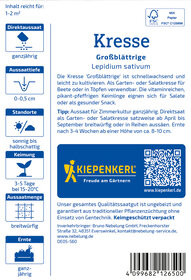 Die Kresse 'Großblättrige' ist die beste Wahl für schnellen Genuss im Garten! Diese leicht zu kultivierende Pflanze eignet sich hervorragend für Beete und Töpfe und lässt sich problemlos anbauen. Die pikant-pfeffrigen Keimlinge sind im Handumdrehen bereit zur Ernte und bringen frische Akzente in Ihre Salate und Gerichte. Genießen Sie die vitaminreichen und geschmackvollen Blätter der Kresse, die Ihren Mahlzeiten das gewisse Etwas verleihen. Egal, ob als Garnitur, in Sandwiches oder unter gemischtem Gemüse – die 'Großblättrige' Kresse sorgt für einen aromatischen Kick und bereichert Ihre Küche mit frischen, gesunden Zutaten. Lassen Sie sich von der Schnelligkeit und Vielseitigkeit dieser Kresse begeistern und holen Sie sich den Genuss direkt aus Ihrem eigenen Garten! Warten Sie nicht länger und holen Sie sich die frischesten Kresse-Sorten in Ihre Küche!| Kurzbezeichnung : | Kresse Glatte großblättrige |