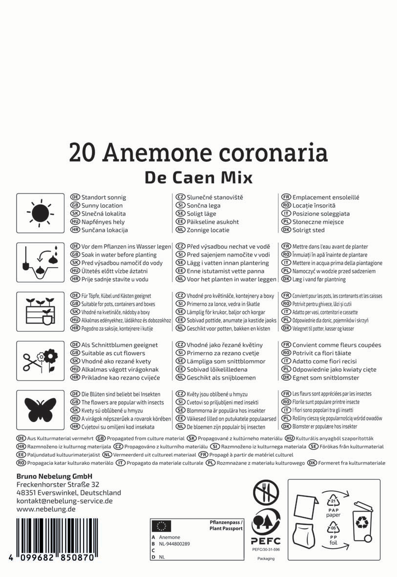 Diese Kronen-Anemonen-Mischung setzt sich aus der Sorte 'De Caen' in unterschiedlichen Farben zusammen. Wenn von Mai bis Juli die zahlreichen Blüten austreiben, leuchtet es im Gartenbeet Weiß, Rot, Rosa und Lila. In Gruppen gepflanzt wirkt dieser Farbmix besonders attraktiv. Die einfachblühenden Anemonen werden nur ca. 20 cm groß und eignen sich neben der Kultur im Beet auch für Kübel und Kästen sowie als Unterpflanzung von lichten Bäumen und Sträuchern. Von Bienen und anderen Nützlingen werden die nektarreichen Blüten nur zu gern besucht.