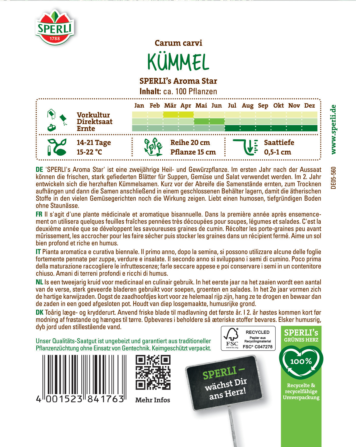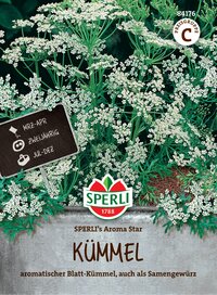 Ein zweijähriges Heil- und Würzkraut stellt der Kümmel 'SPERLI's Aroma Star' dar. Es kann vorkultiviert oder direkt im Freiland ausgesät werden, möglichst an einem sonnigen Platz mit einem tiefgründigen, humosen Boden ohne Staunässe. Im ersten Jahr wirst Du in den Genuss des leuchtend grünen Krautes kommen, welches stark an Möhrenkraut erinnert. Dieses kannst Du zum Abschmecken für Suppen, Salate und generell zum Verfeinern von Gemüse bestens verwenden.