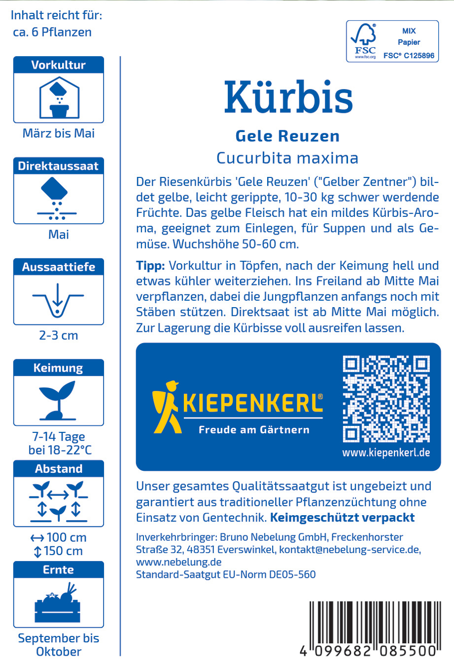 Der Riesenkürbis 'Gele Reuzen', auch bekannt als "Gelber Zentner", beeindruckt mit seinen gelben, leicht gerippten Früchten, die ein Gewicht von 10 bis 30 kg erreichen können. Das leuchtend gelbe Fruchtfleisch bietet ein mildes Kürbis-Aroma und eignet sich hervorragend für verschiedene Anwendungen, sei es zum Einlegen, für Suppen oder als schmackhaftes Gemüse. Diese robuste Sorte überzeugt nicht nur durch ihre beeindruckende Größe, sondern auch durch ihren hohen Ertrag und die einfache Handhabung. Pflanzen Sie den Riesenkürbis 'Gele Reuzen' in Ihrem Garten und entdecken Sie die vielfältigen Verwendungsmöglichkeiten dieser außergewöhnlichen Früchte. Sie sind optimal für größere Anbauflächen geeignet und begeistern sowohl mit ihrem markanten Aussehen als auch mit ihrem köstlichen Geschmack. Lassen Sie sich von der Freude am eigenen Anbau inspirieren und genießen Sie die kulinarischen Möglichkeiten, die dieser beeindruckende Kürbis bietet! Machen Sie Platz für den Riesenkürbis 'Gele Reuzen' und genießen Sie die reichhaltige Ernte!| Kurzbezeichnung : | Kürbis Gele Reuzen |