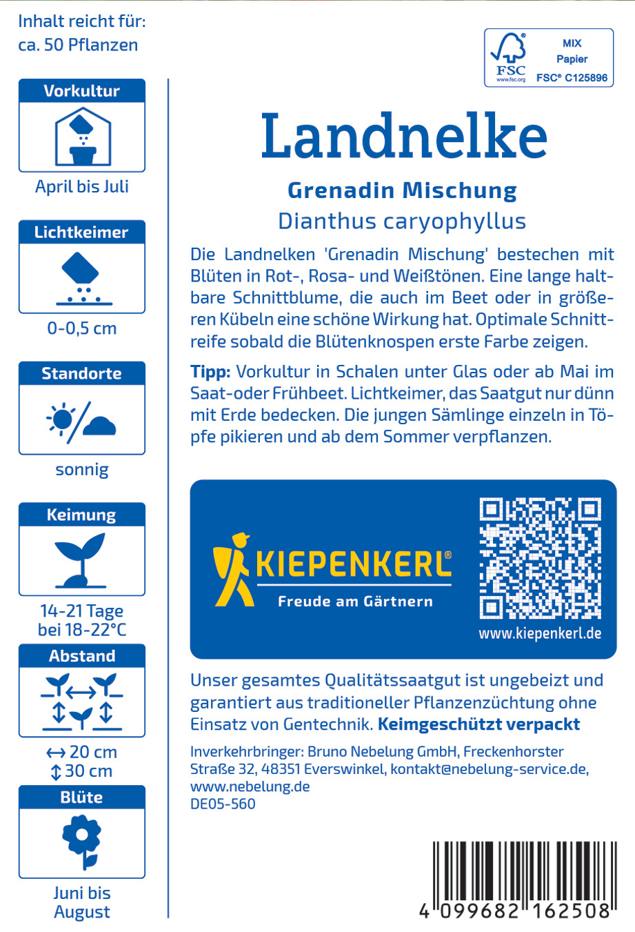 Die Landnelke 'Grenadin Mischung' verzaubert mit ihren gefüllten, warmen Blüten und bringt eine fröhliche Atmosphäre in Ihren Garten! Diese bezaubernde Pflanze erreicht eine Höhe von 50 bis 60 cm und ist ideal für lebendige Beete sowie als Schnittblume geeignet. Erleben Sie die Lebensfreude der Landnelke und genießen Sie, wie sie Ihre Gartenlandschaft zum Erblühen bringt! Ihre leuchtenden Blüten sind nicht nur ein Augenschmaus, sondern auch hervorragend geeignet für frische Sträuße, die jedem Raum eine einladende Atmosphäre verleihen. Lassen Sie sich von der Pracht der 'Grenadin Mischung' inspirieren und bringen Sie Farbe und Freude in Ihr Zuhause – eine ideale Wahl für jeden Gartenliebhaber! Entdecken Sie die Landnelke und verwandeln Sie Ihren Garten in ein blühendes Paradies!| Kurzbezeichnung : | Landnelke Grenadin Mischung |