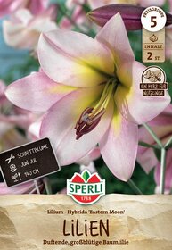 Die Liliensorte 'Eastern Moon' fällt besonders wegen ihrer großen Blüten auf, die sich durch einen prächtigen Farbverlauf während ihrer Blütezeit von Rosa zu Weiß auszeichnen. Dabei versprüht diese Blume einen herrlich intensiven Duft. 'Eastern Moon' ist winterhart, sodass sie Dein Blumenbeet, gerne in der Gruppe gepflanzt, für eine lange Zeit schmücken kann! Von Vorteil ist dafür ein humoser Boden in sonniger bis halbschattiger Lage. Wichtig ist außerdem, dass die Pflanzen im Winter keiner Staunässe ausgesetzt sind. Nach erfolgreicher Überwinterung wächst 'Eastern Moon' in der nächsten Saison wieder auf stolze 140 cm Höhe heran und treibt im Juni und Juli ihre formschönen Blüten aus.
