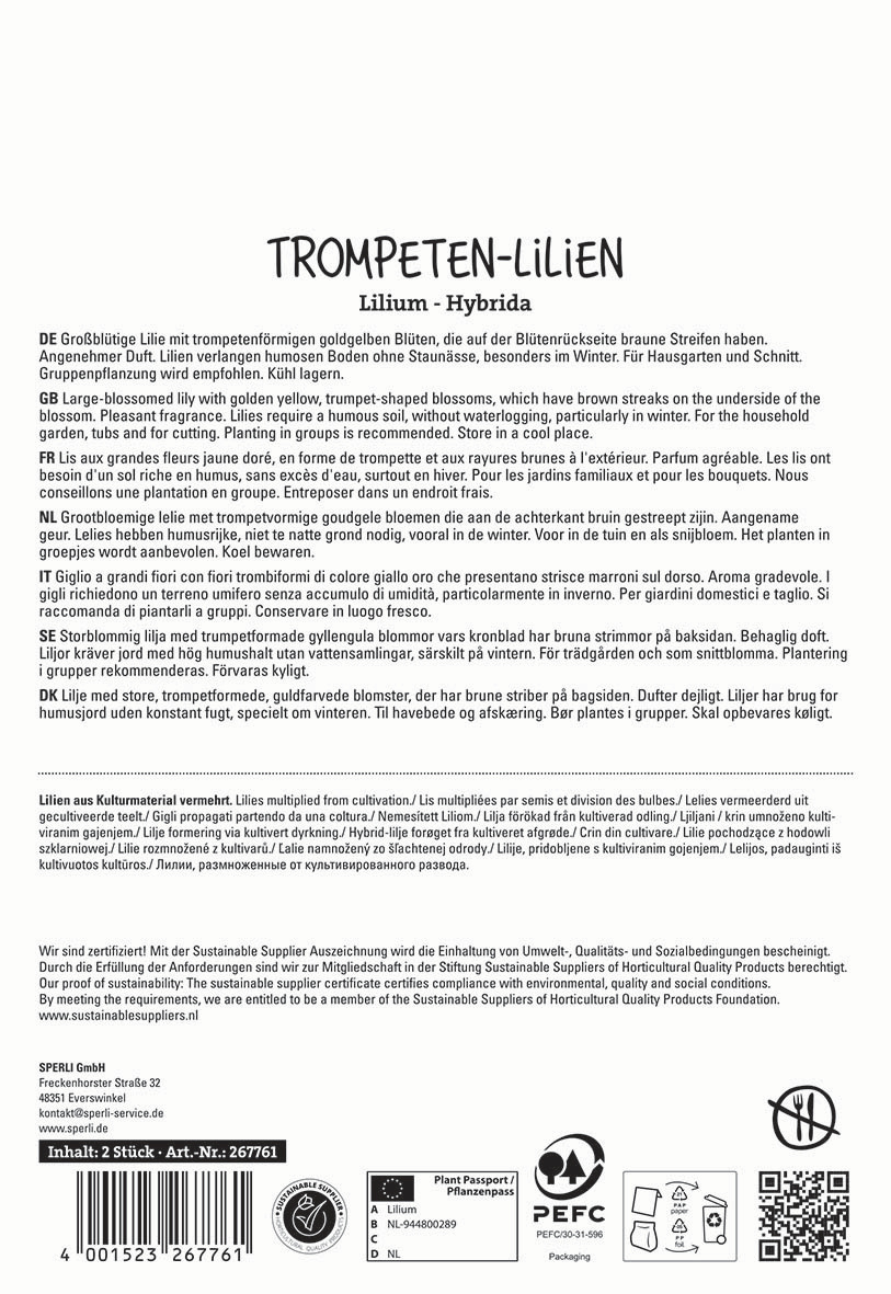 Du suchst ein Highlight für Deine Beete? Dann ist die Lilie 'Golden Splendor' die richtige Wahl! Diese Lilie fällt zum einen durch die großen, trompetenförmigen, gelben Blüten auf, die auf der Rückseite der Blätter mit braune Streifen dekoriert sind. Zum anderen wird sie stolze 150 cm groß. An dem lieblichen Duft kannst Du Dich mehrjährig erfreuen. Durch das Pflanzen setzt Du Dich zudem für die Natur ein, da der enthaltene Nektar eine wichtige Zusatznahrung für Insekten darstellt. Die winterharte Lilie bevorzugt eine Gruppenpflanzung sowie einen Standort, der sonnig oder halbschattig liegt. Der Boden sollte viel Humus enthalten. Vermeide außerdem Staunässe, dann wirst Du lange Freude an der sonnengelben Lilie haben!>