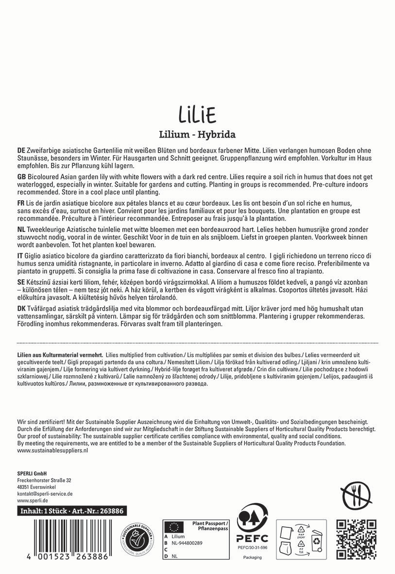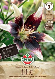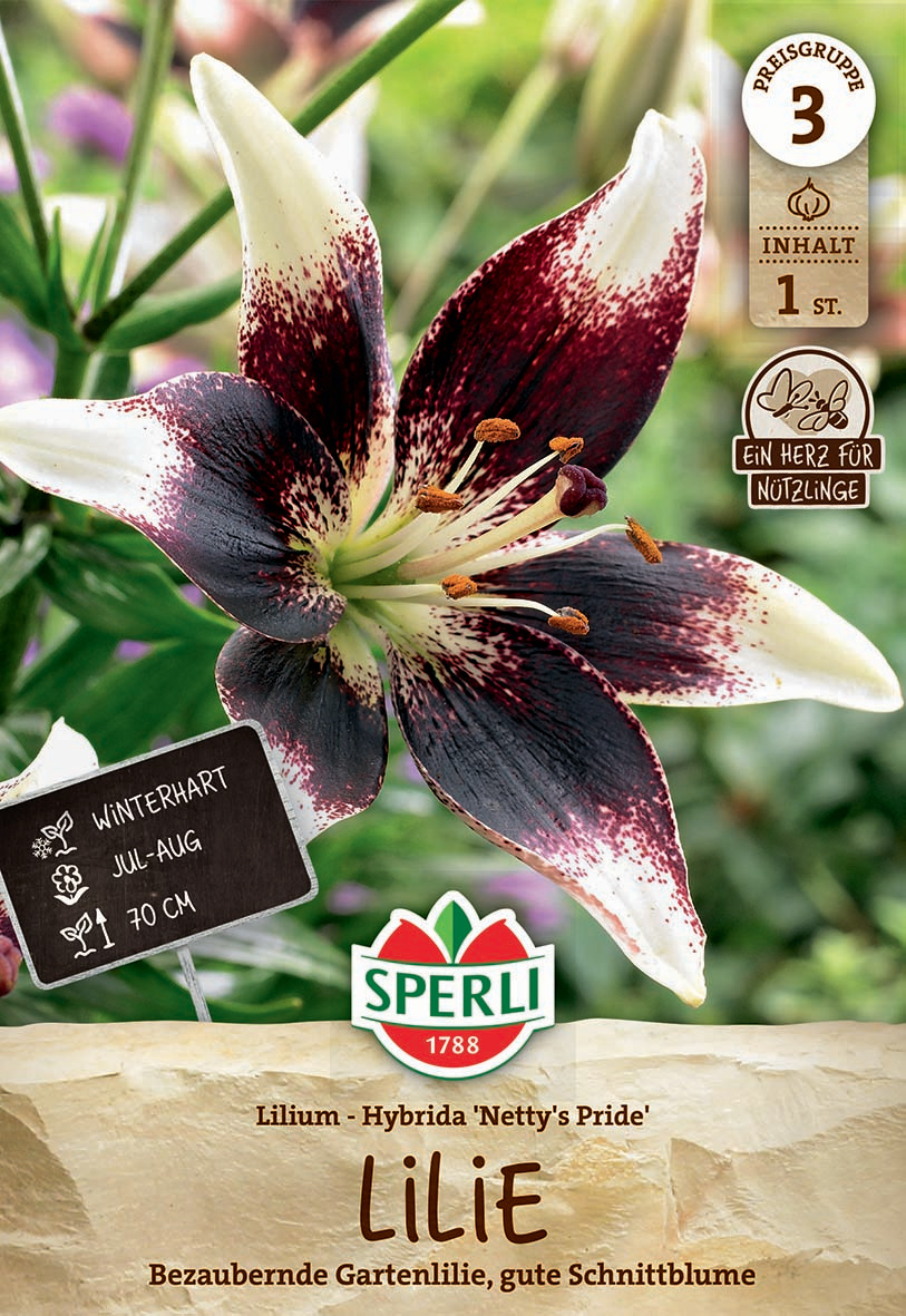 Die asiatische Premium-Lilie 'Nettys Pride' zeigt wunderschöne, zweifarbige Blüten mit weißen Blütenblättern und bordeauxfarbener Mitte. Die mehrjährige Gartenlilie verwildert mit den Jahren in Deinen Beeten. Kultiviere sie im Haus vor und pflanze die Knollen an einen Ort, der sonnig oder halbschattig liegt, gerne als Gruppenpflanzung. Besonders wohl fühlt sich diese Sorte in humosem Boden. Die winterharte Lilie erreicht eine Wuchshöhe von 70 cm und beeindruckt damit auch besonders geschnitten in der Blumenvase. Tipp: Vermeide im Speziellen im Winter Staunässe in den Beeten. Da 'Nettys Pride' viel Nektar enthält, dient sie als zusätzliche Nahrungsquelle für Insekten. Die Blumenzwiebeln müssen kühl aufbewahrt werden.| Kurzbezeichnung : | Lilie Netty's Pride |