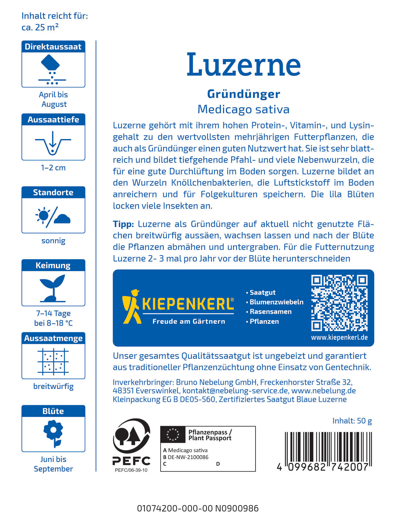 Luzerne gehört zu den wertvollsten mehrjährigen Futterpflanzen aufgrund ihres hohen Proteingehalts. Die tiefgehenden Wurzeln verbessern die Belüftung des Bodens. Ihre attraktiven lila Blüten ziehen zahlreiche Insekten an und fördern die Bodenfruchtbarkeit durch die Anreicherung von Luftstickstoff. Fügen Sie Luzerne Ihrem Garten hinzu und unterstützen Sie die Gesundheit des Bodens! Diese Pflanze ist die perfekte Ergänzung für ökologische Gartenprojekte und ein wichtiger Baustein für nachhaltige Anbaumethoden. Genießen Sie die Vorteile, die eine lebendige Gartengestaltung mit Luzerne bietet! Entdecken Sie die Vorteile der Luzerne für Ihren Garten!| Kurzbezeichnung : | Luzerne Saat-Alfalfa |