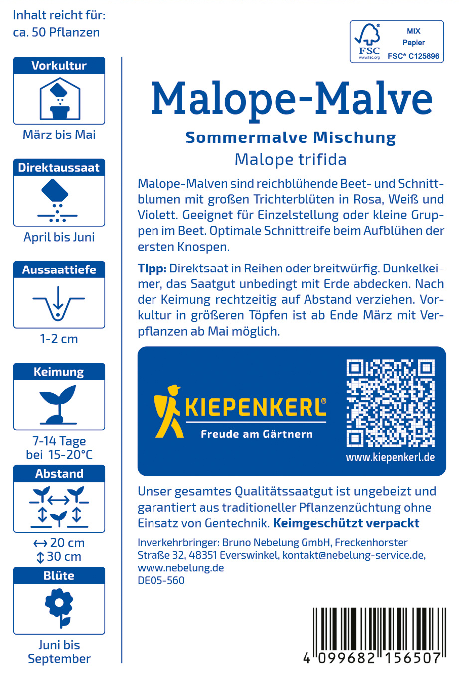 Die Malope-Malven sind reichblühende Beet- und Schnittblumen, die mit ihren großen, trichterförmigen Blüten in Rosa, Weiß und Violett begeistern. Diese mehrjährigen Pflanzen erreichen eine Höhe von 60–80 cm und sind ideal für Gruppenbepflanzungen sowie individuelle Akzente, die Ihrem Garten eine besondere Note verleihen. Erleben Sie die üppige Blütenfülle und die zauberhafte Erscheinung der Malope-Malven. Ihre strahlenden Farben machen sie zur perfekten Wahl für die Gestaltung von Beeten und außergewöhnlichen Sträußen. Lassen Sie sich von der Vielfalt dieser wunderschönen Blumen inspirieren und bringen Sie ein fröhliches Farbenspiel in jeden Gartenbereich. Mit ihren eleganten Blüten sind die Malope-Malven nicht nur ein Blickfang, sondern auch eine Bereicherung für jeden Blumenliebhaber! Erleben Sie die elegante Blumenfarbe der Malope-Malven in Ihrem Garten!| Kurzbezeichnung : | Malope-Malve Sommermalve Mischung |