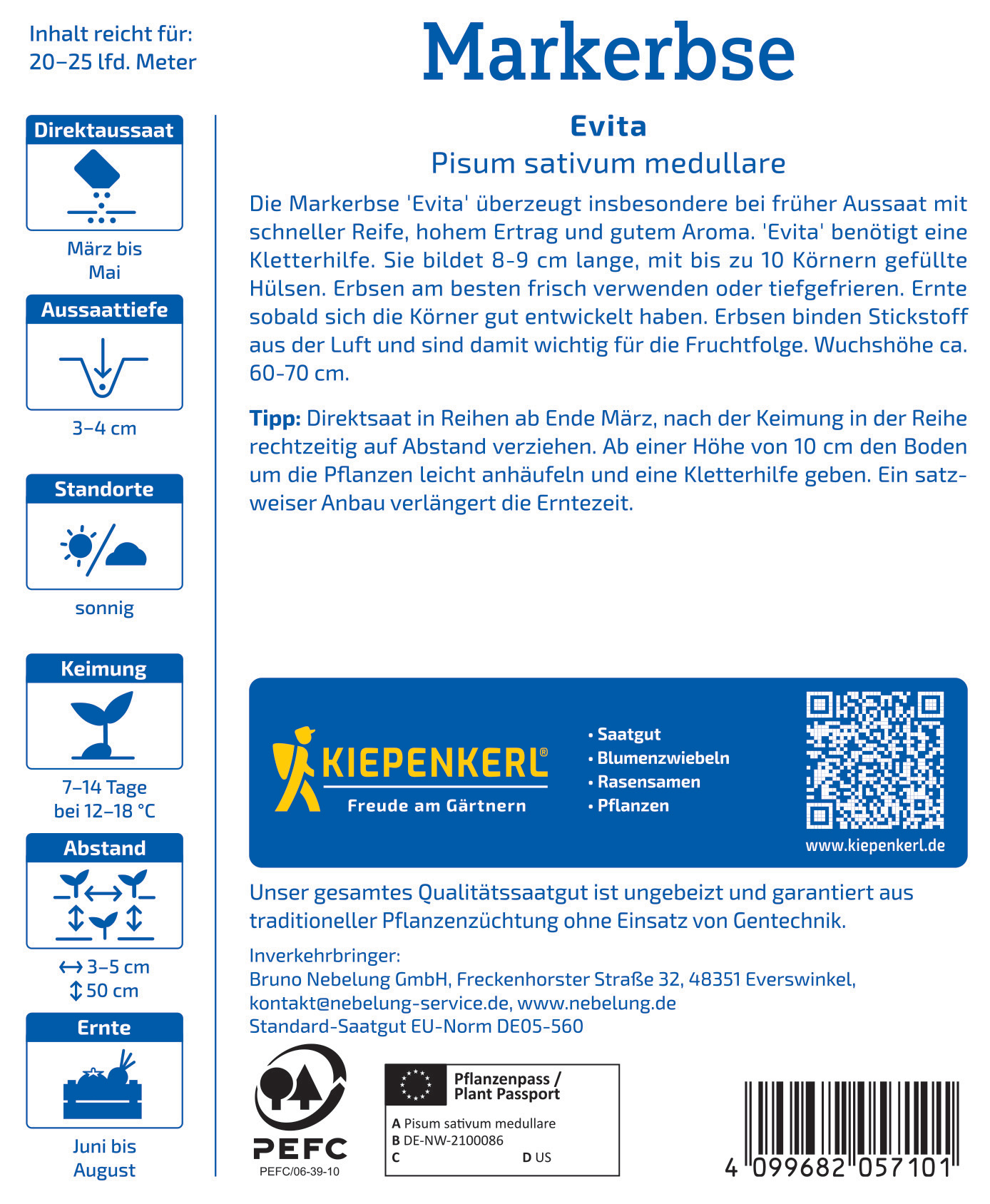 Die Markerbse 'Evita' überzeugt besonders bei früher Aussaat mit schneller Reife und hohem Ertrag. Diese ertragreiche Sorte benötigt eine Kletterhilfe und bildet 8-9 cm lange Hülsen, die mit bis zu 10 Körnern gefüllt sind. Ernten Sie die Körner, sobald sie gut entwickelt sind, um den besten Geschmack zu gewährleisten. Auch diese Erbsen lassen sich frisch verwenden oder tiefgefrieren. Mit einer Wuchshöhe von ca. 60-70 cm passt 'Evita' perfekt in jeden Garten und bringt Genuss in Ihre Küche. Erbsen binden Stickstoff aus der Luft und sind damit wichtig für die Fruchtfolge. Erleben Sie die Frische und Fülle dieser köstlichen Erbse! Bringen Sie die Markerbse 'Evita' in Ihren Garten für köstliche Erträge!| Kurzbezeichnung : | Markerbse Evita, Vorteilspackung |