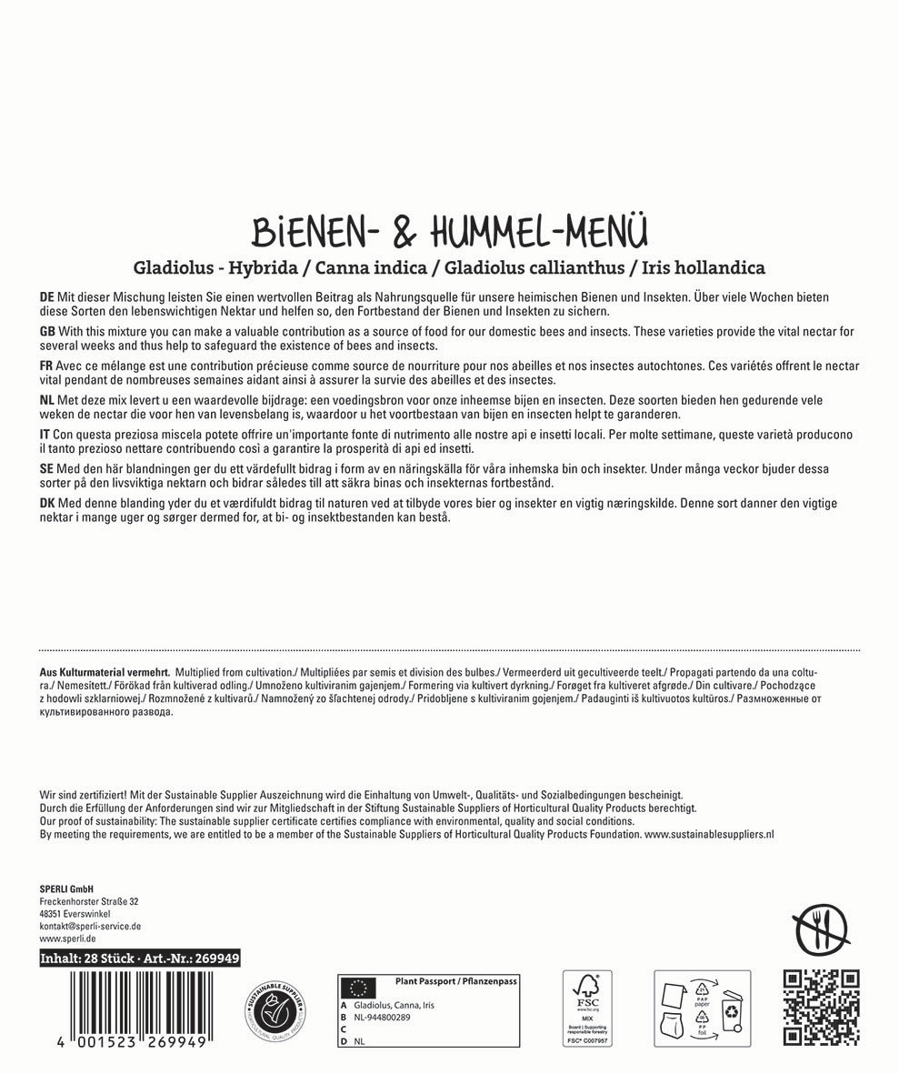 Für Hummeln und Bienen ist die Mischung 'Bienen- und Hummel-Menü' ein echtes Paradies. Die vielen unterschiedlichen Blumen bieten eine breite Auswahl köstlichem Nektar für die Nützlinge. Für Dich hält die Mischung außerdem ein wunderschön buntes Farbenspiel bereit. Die Blüten erstrahlen in Gelb und Rot oder sind zweifarbig oder lachsfarben. Die Wuchshöhe der Blumen liegt zwischen 60 cm und 120 cm.| Kurzbezeichnung : | Maxi Pack Bienen- & Hummelmenü |