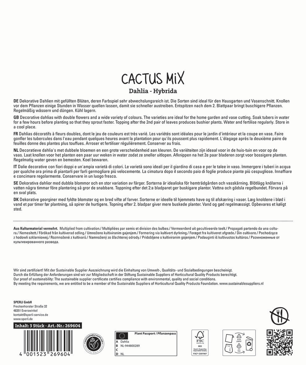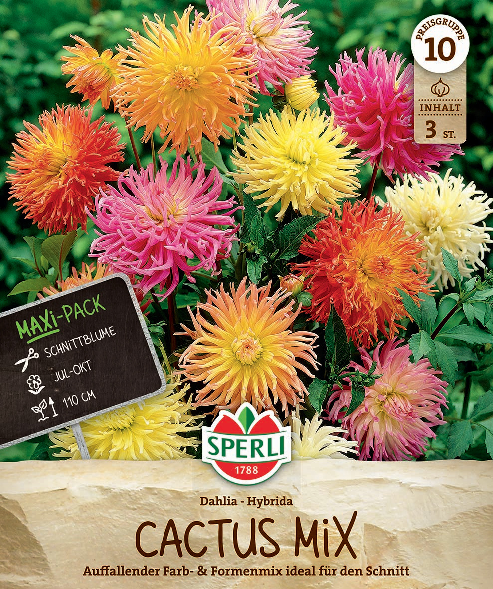 Erlebe die faszinierende Kaktusdahlien-Mischung von Sperli und lass Dich von der Vielfalt und Schönheit dieser Sommerblüher verzaubern! Diese Mischung besteht aus drei verschiedenen Sorten Kaktusdahlien und wird zwischen 100 und 120 cm hoch. Die Kaktusdahlien sind dankbare Begleiter, die Dir monatelang Freude bereiten und vom Juli bis zum ersten Frost in voller Blüte stehen.Pflanze die Knollen im Frühjahr in gut durchlässige Erde, aber achte darauf, dass Du die empfindlichen Dahlien vor Spätfrösten schützt. Der Pflanzabstand sollte 60 cm betragen. Gieße die Knollen sofort nach dem Pflanzen – so freuen sie sich auf einen kräftigen Start in die Saison! Kaktusdahlien blühen am üppigsten in voller Sonne.
