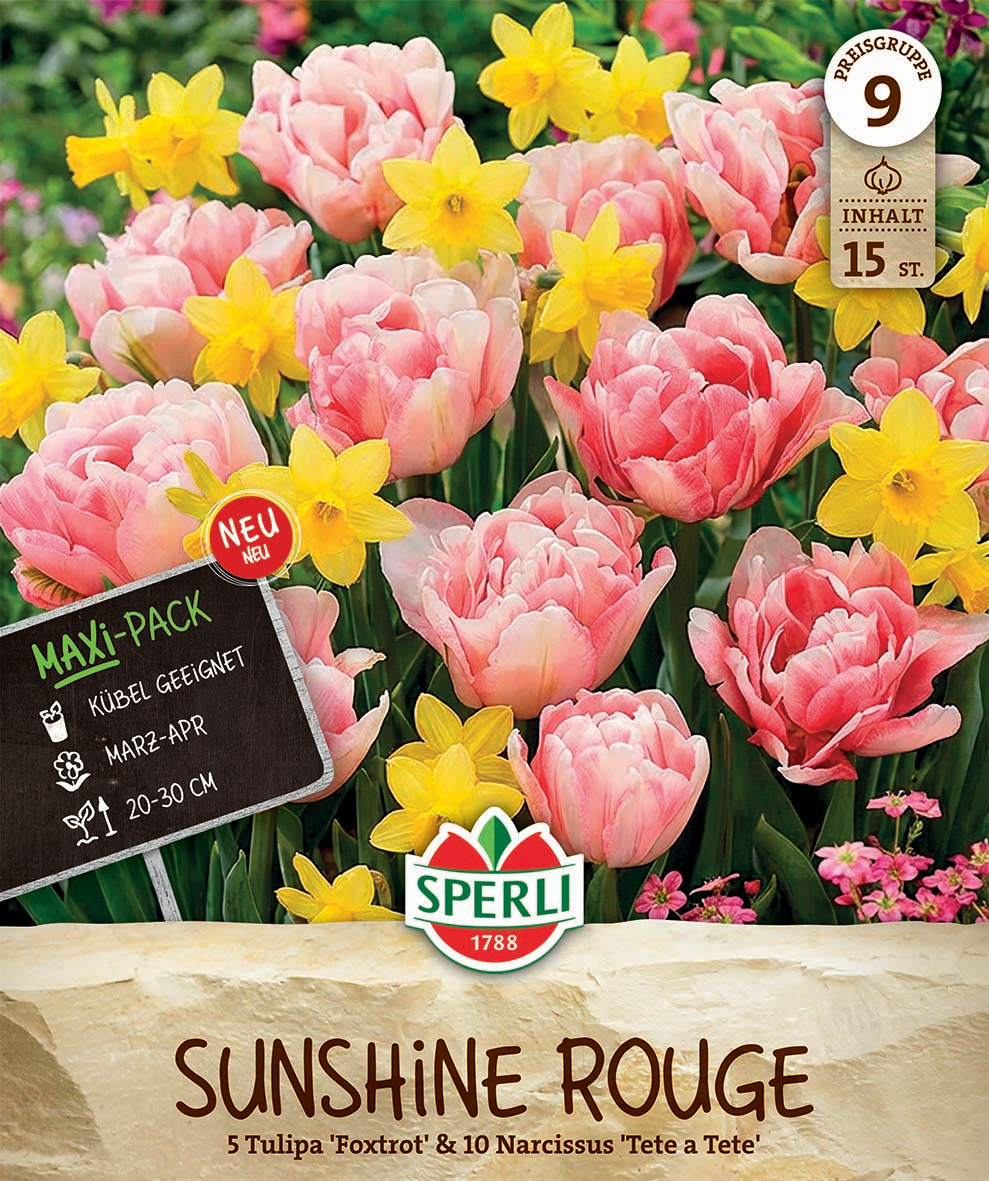 Mit dem Sunshine Rouge Mix von SPERLI holst Du Dir eine perfekt abgestimmte Mischung aus fröhlichen Narzissen und romantischen Tulpen in Deine Pflanzgefäße und Beete. Die Mischung besteht aus der kleinblütigen, botanischen Narzisse ‘Tete a Tete’ in Sonnengelb und der gefüllten frühen Tulpe ‘Foxtrot’ in Rosa-Rot. Zusammen sorgen sie von März bis April für ein lebendiges Farbspiel aus Gelb und zarten Rosatönen.Mit einer Wuchshöhe von etwa 20–30 cm ist der Sunshine Rouge Mix ideal für kleine Pflanzgefäße, Balkonkästen, Kübel und den Hausgarten geeignet. Durch die eher kompakte Höhe lassen sich die Blumenzwiebeln sehr gut in Gruppen pflanzen oder als Etagenpflanzung in Töpfen und Kübeln setzen. So entsteht auf kleinem Raum ein dichter Blütenflor, der perfekt auf Balkon und Terrasse passt. Die Narzissenzwiebeln ‘Tete a Tete’ bringen viele kleine, sonnengelbe Blüten, während die gefüllten Tulpen ‘Foxtrot’ mit rosa-roten, dicht gefüllten Blüten für einen weichen, fast pfingstrosenartigen Effekt sorgen.