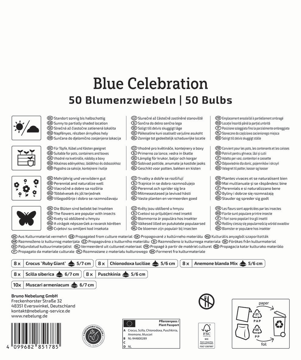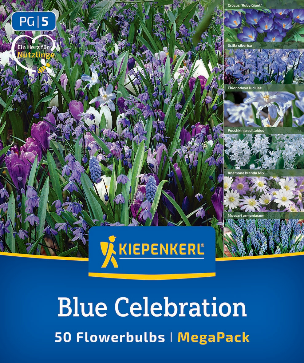 Die Blumenzwiebelmischung `Blue Celebration Mix` von Kiepenkerl besticht mit den blauen Farbtönen der enthaltenen Frühlingsblüher. Das Artenspektrum reicht von Krokussen und Anemonen über Trauben- und Sternhyazinthen bis hin zu Puschkinien und Blausterne. Aufgrund ihrer unterschiedlichen Blühzeiten erstreckt sich der Blütezeitraum dieser Mischung insgesamt von Februar bis März. Für Bienen, Hummeln & Co. stellen die Blumenschönheiten damit über lange Zeit eine abwechslungsreiche Nahrungsquelle dar.