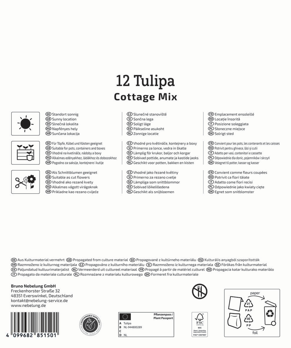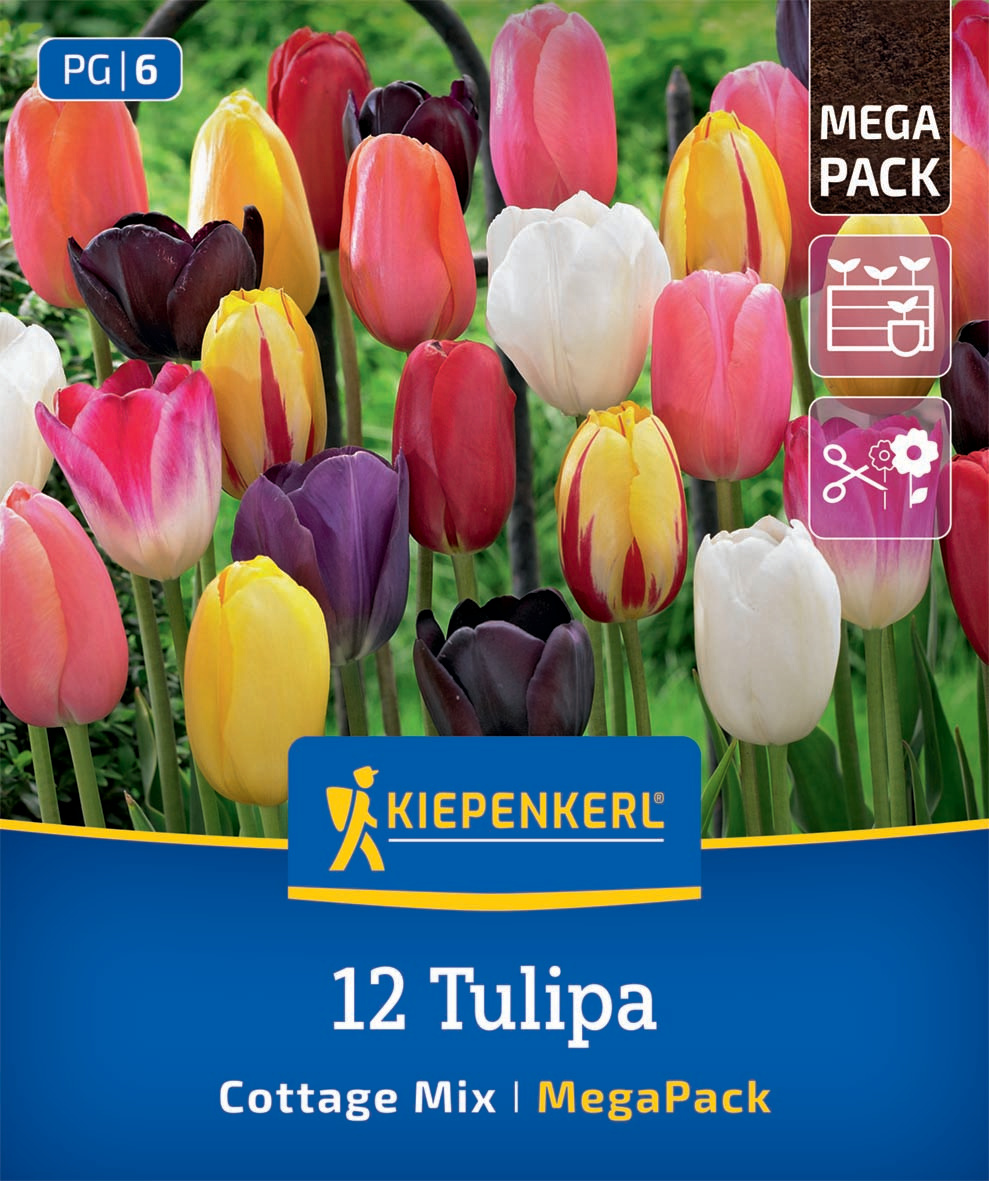 Das Mega-Pack Tulpenmischung 'Cottage Garden' ist ein imposanter Tulpen-Mix, wie er früher in englischen Gärten anzutreffen war. Die 17 enthaltenen Tulpenzwiebeln sind perfekt geeignet für Cottage-Gärten, fügen sich aber auch anderswo stilvoll ein und sorgen zur Blütezeit im Mai stets für einen farbenfrohen Blickfang.
