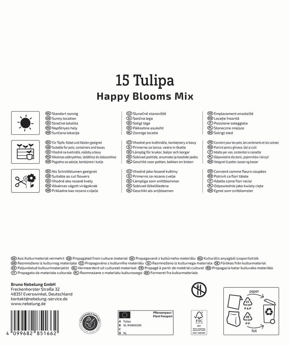 Ideal ist der ‘Happy Bloom Mix' für die Verwendung im Gartenbeet oder auch im Kübel, um einen atemberaubenden Blumenstraußeffekt zu erzielen. Pflanzen Sie die Tulpen dicht in Gruppen zusammen, um einen lebendigen und farbenfrohen Akzent zu setzen, der die Blicke auf sich zieht und Ihren Außenbereich in eine blühende Oase verwandelt.