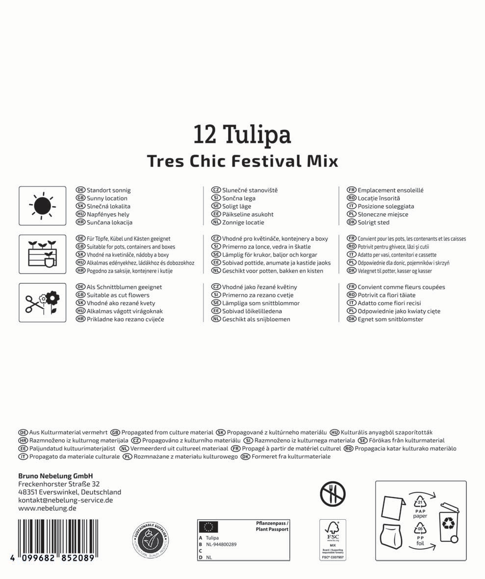 Vielfältige Schönheit in einer praktischen Großpackung - die Tulpenmischung 'Tres Chic Festival Mix'. Diese Mischung besteht aus lilienblütigen Tulpen in den strahlenden Farben Weiß, Gelb und Rot, und begeistert mit ihrer einzigartigen Blütenform, die an elegante Lilien erinnert. Die zarten Blütenblätter verbreiten einen Hauch von Anmut und Eleganz, sowohl im Gartenbeet als auch in dekorativen Arrangements. Mit einer Wuchshöhe von ca. 40-50 cm eignen sich die Tulpen des ‘Tres Chic Festival Mix’ perfekt für mittlere bis hohe Beete. Sie sind eine bemerkenswerte Wahl für Gartenliebhaber, die nach farbenfroher Vielfalt suchen. Diese Tulpen sind nicht nur eine Augenweide im Garten, sondern auch ideal für die Verwendung als Schnittblumen.| Kurzbezeichnung : | Mega-Pack Lilienblütige Tulpen Tres Chic Mix |