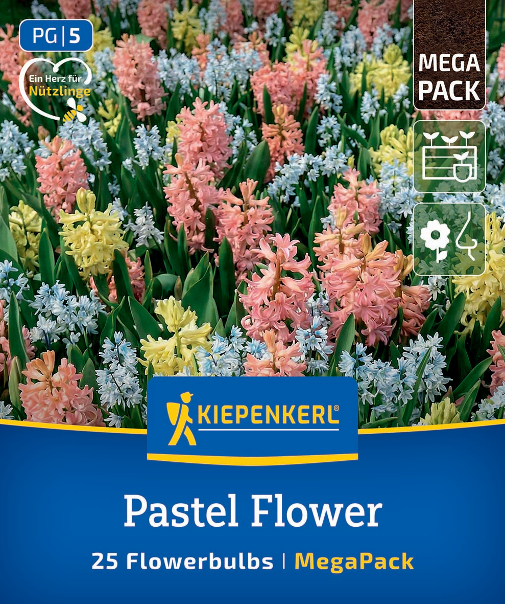 Das zauberhafte Kiepenkerl Mega-Pack `Pastel Flower`, wird mit ihren sanften Farben und himmlischen Düften jeden Garten verzaubern. Diese Mischung umfasst pastellfarbige Hyazinthen in zartem Lachsorange und hellem Gelb, sowie pastellblaue Puschkinien. Inspiriert von der Trendfarbe Peach Fuzz sind diese Blütenfarben perfekt für zeitgemäße Gartengestaltungen oder trendige Pflanzkombinationen.Die vielseitigen Verwendungsmöglichkeiten dieser Hyazinthen-Puschkinien-Mischung machen sie zu einem unverzichtbaren Element für jeden Pflanzenliebhaber. Mit ihrer geringen Wuchshöhe und ihrer Anspruchslosigkeit eignen sie sich ideal für Beete, Töpfe, Kübel und sogar für die Bepflanzung von Balkonkästen. Die Blüten ziehen nicht nur Nützlinge an, sondern verleihen auch Ihrem Garten eine traumhafte Atmosphäre und bieten eine wertvolle Nahrungsquelle für bestäubende Insekten.