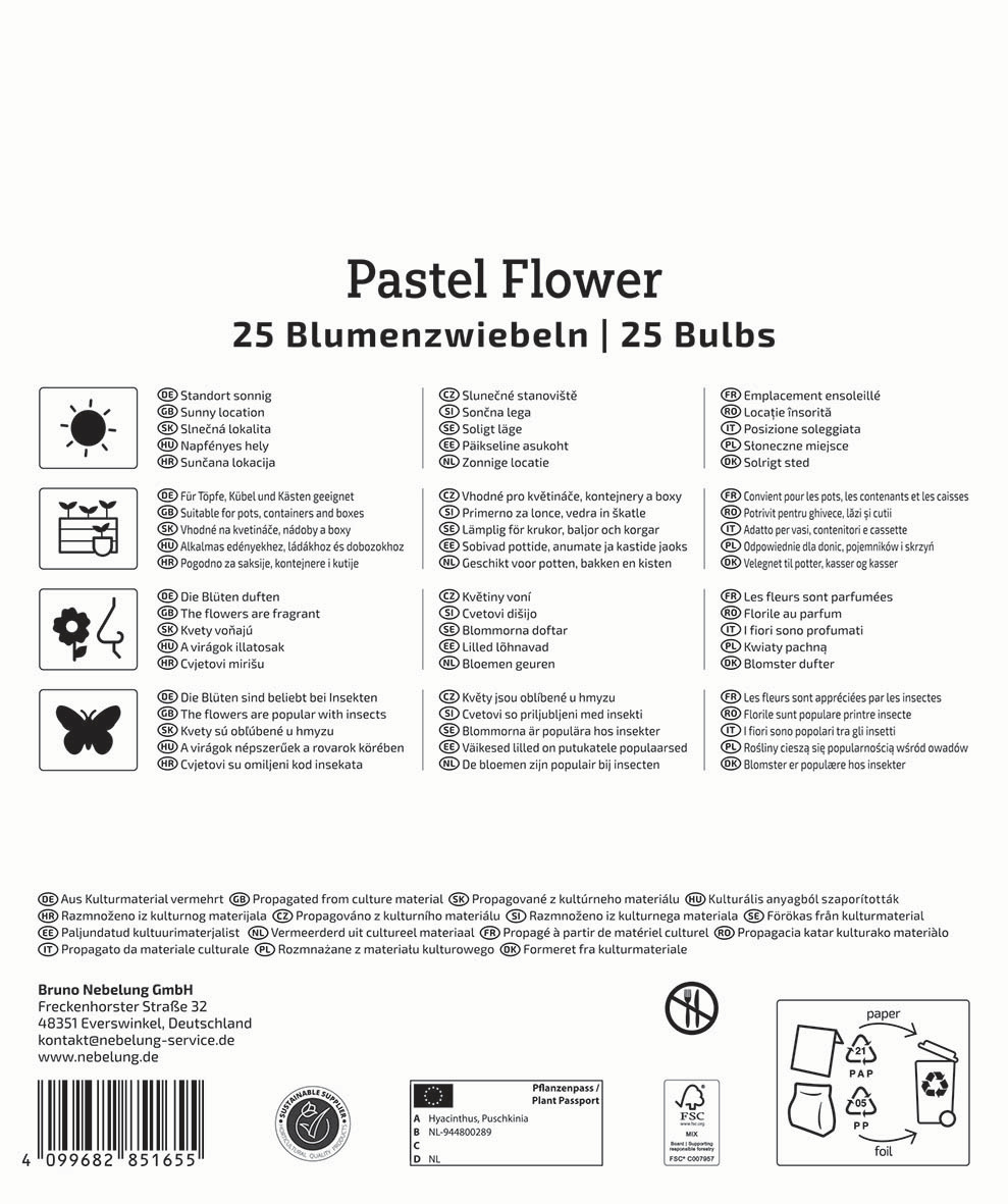 Verwenden Sie die `Pastel Flower`- Mischung als Grundlage für eine Etagen- bzw. Lasagnebepflanzung im Kübel. Kombinieren Sie dazu gefüllte oder einfache spätblühende Tulpen sowie weiße Narzissen. Auf diese Weise lassen sich bis in den Mai hinein, zauberhafte Blüten zu bestaunen.