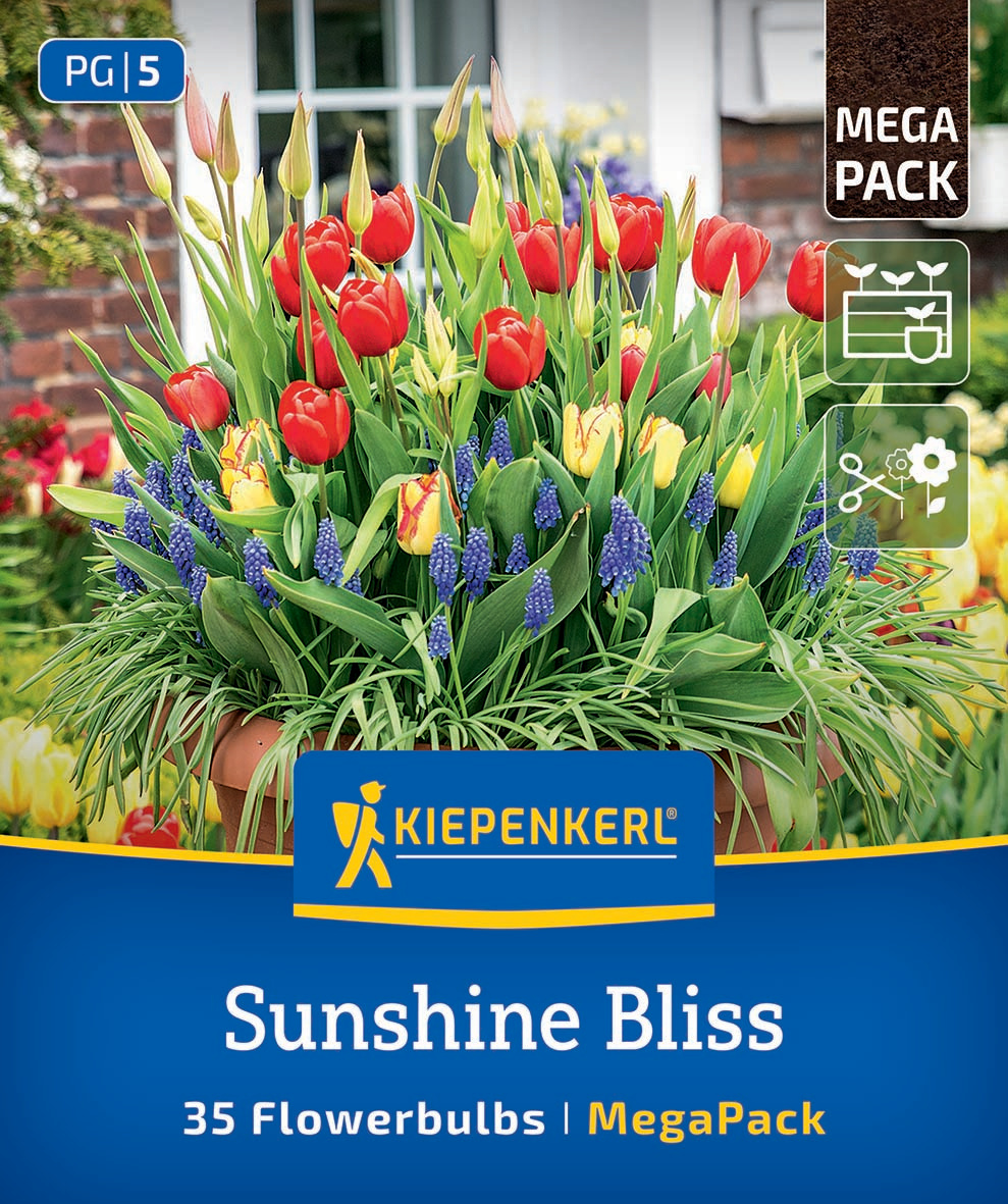 Der 'Sunshine Bliss Mix' im Mega-Pack vereint die kräftigen Farben Rot und Gelb mit den tiefblauen Tönen zu einem beeindruckenden Spektakel für jeden Garten oder jede Terrasse. Diese Kombination aus leuchtenden Blütenfarben sorgt für eine lebendige und harmonische Atmosphäre, die durch die versetzten Blütezeiten lange bestehen bleibt.In einem großen Kübel angelegt, zeigt sich die Schönheit dieser Mischung besonders gut, da die Pflanzen durch eine mehrschichtige Pflanztechnik optimal zur Geltung kommen. Die früh blühenden Traubenhyazinthen in der obersten Schicht werden nahtlos von den darunterliegenden Tulpen ergänzt, die ihre Blütenpracht später entfalten. Die Blumenzwiebel-Kombination in den Primärfarben ist ein Blütenfeuerwerk, der sowohl in sonnigen als auch in halbschattigen Lagen seine volle Wirkung entfaltet.