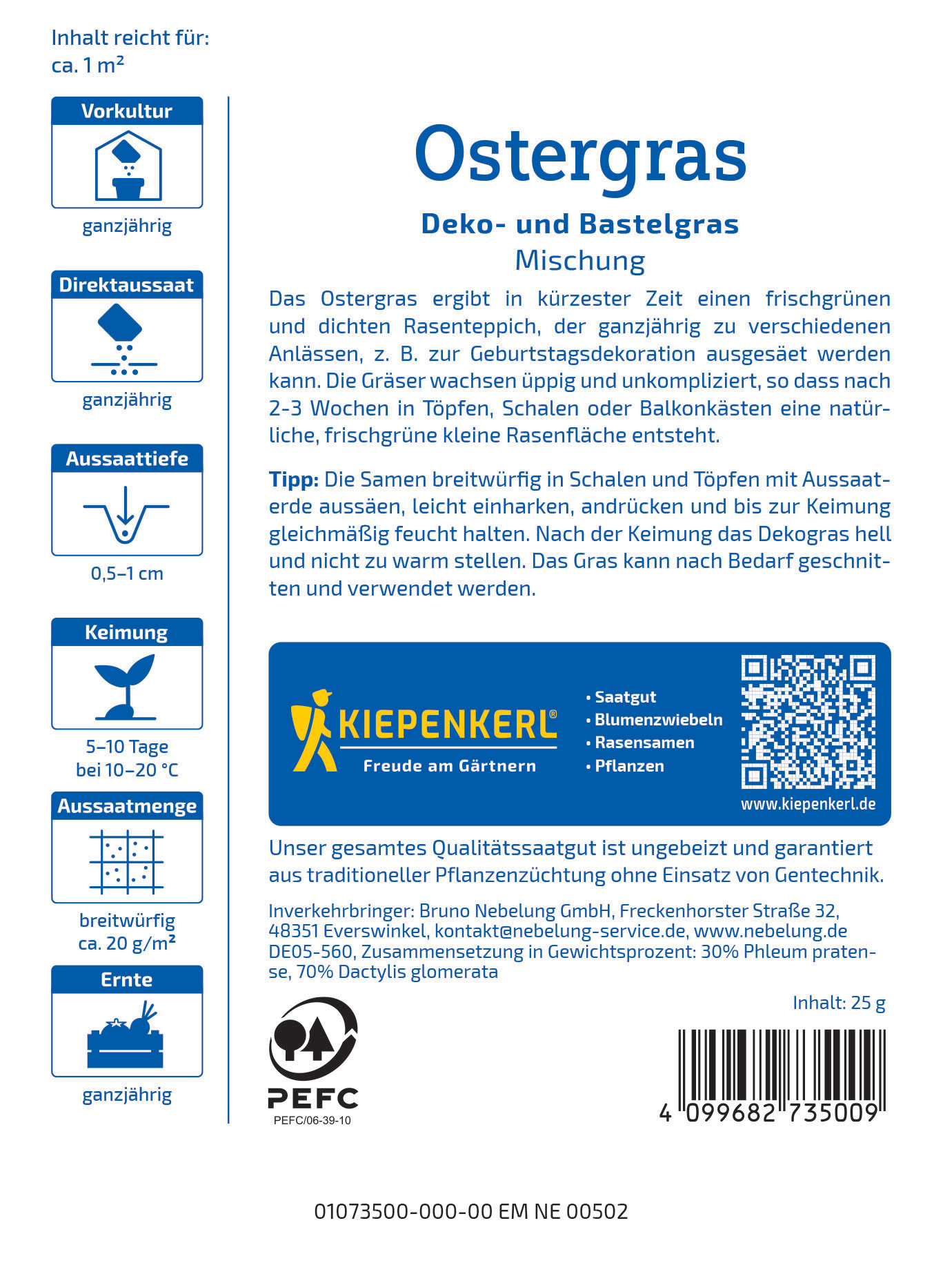 Das Ostergras ist eine dekorative, üppig grüne Ergänzung für Ihre Feierlichkeiten, besonders zu Ostern. Dieses schnellwüchsige Gras kann in Töpfen oder Schalen ausgesät werden und verwandelt Ihren Raum in ein niedliches Frühlingsparadies. Es erfreut nicht nur Kinder, sondern auch Erwachsene und schafft eine festliche Atmosphäre. Nutzen Sie das grasige Grün als hübsche Dekoration für Ihren Ostertisch oder als Überraschung im Osternest! Lassen Sie sich von der Frische und dem Charme des Ostergrases inspirieren! Bringen Sie mit unserem Ostergras frühlingshafte Stimmung in Ihr Zuhause!| Kurzbezeichnung : | Ostergras Deko- und Bastelgras |