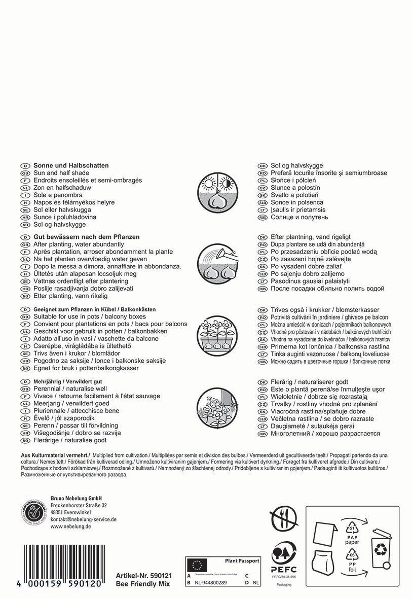 Die Pegasus Bienenfutterquelle im Big Bag bietet eine farbenfrohe und bunte Oase für Bienen und andere nützliche Insekten, während sie gleichzeitig ein aktives Zeichen für den Naturschutz setzt. Diese wohlüberlegte Mischung aus Tulpen, Anemonen, Krokussen, Blausternen und Sternhyazinthen blüht von Februar bis April und versorgt Bienen, Hummeln, Schmetterlinge und weitere Insekten mit essentieller Nahrung im frühen Jahr. Mit kompakten Wuchshöhen von 10 bis 25 cm sind diese mehrjährigen und winterharten Blumen optimal für die Kultivierung in Gefäßen geeignet und fühlen sich besonders im Halbschatten wohl. Die Mischung enthält insgesamt 40 Blumenzwiebeln, was eine üppige Begrünung ermöglicht und sich hervorragend zur Unterpflanzung vor Sträuchern und Bäumen eignet. Dank ihrer frühen Blütezeit, die bereits im Februar mit dem Winterling beginnt, bieten diese Pflanzen wertvolle Nahrungsressourcen für Wild- und Honigbienen. Die Pflanzen verwildern gut und fördern so die nachhaltige Begrünung und Biodiversität. Mit der Pegasus Aktion Bienenfutterquelle wird jeder Garten oder Balkon zu einem farbenfrohen Blickfang und gleichzeitig zu einem wichtigen Lebensraum für unsere bestäubenden Insekten.| Kurzbezeichnung : | Pegasus Aktion Bienenfutterquelle |