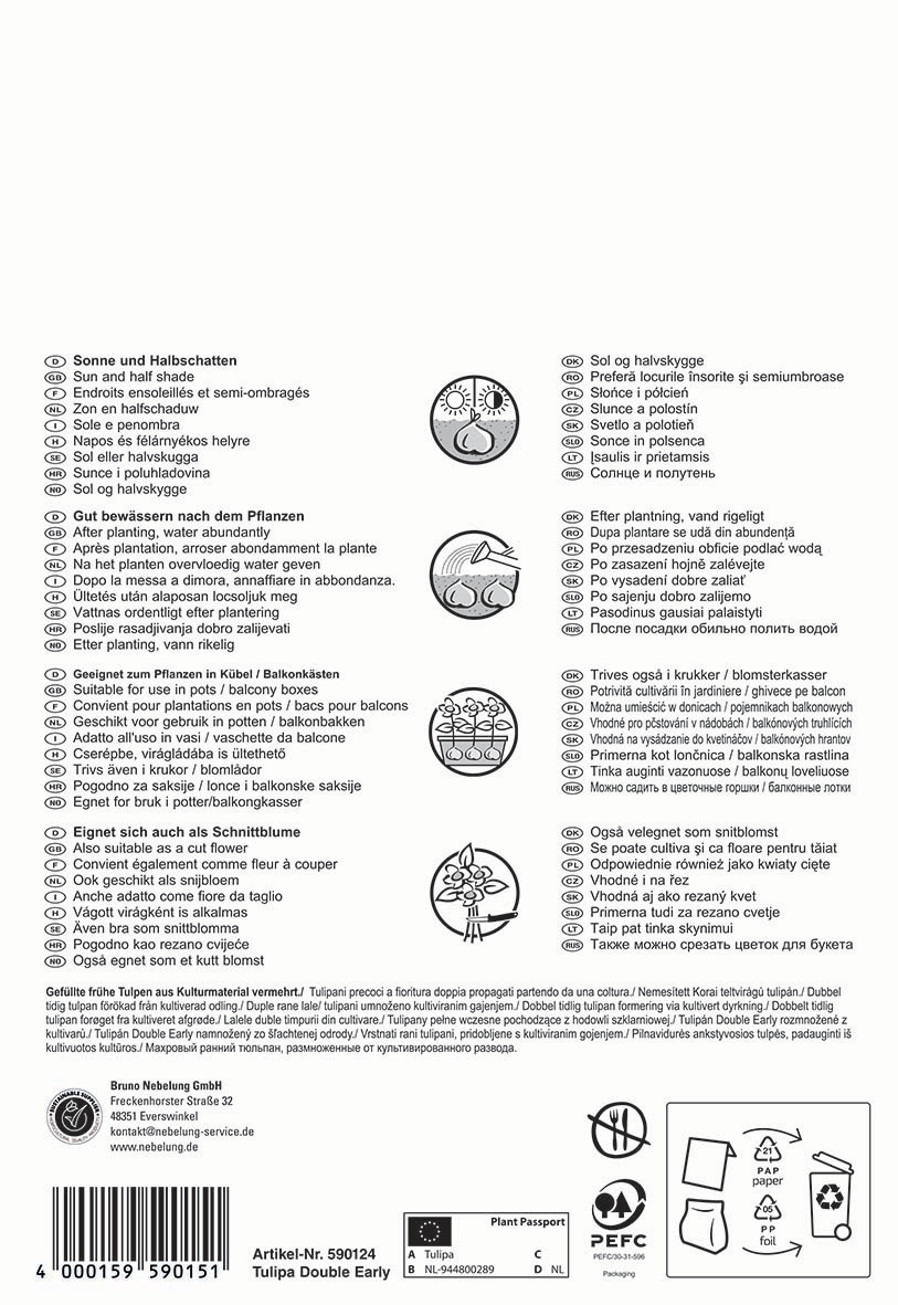 Die Pegasus Gefüllte Tulpe Double Mischung (Tulipa x Hybrida) im Big Bag bietet eine bezaubernde Auswahl an Tulpen mit großen, dichtblühenden Blüten und einem niedrigen Wuchs. Diese Eigenschaften machen sie äußerst vielseitig einsetzbar und ideal für zahlreiche Gartenanwendungen. Die Mischung enthält eine beeindruckende Palette von Farben und Sorten, die Beete und Rabatten ebenso verschönern wie Kübel und Tröge. Die üppigen Blüten sind nicht nur wunderschön anzusehen, sondern auch perfekt als Schnittblumen geeignet, um Innenräume zu schmücken. Ab April entfalten diese Tulpen ihre prachtvollen Blüten. Dank ihrer geringen Größe sind sie besonders gut für die Kultivierung in Gefäßen geeignet, was sie zu einer flexiblen Bereicherung für jeden Garten oder Balkon macht. Diese Tulpen setzen farbenfrohe Akzente und bringen Eleganz und Schönheit in jede Umgebung.| Kurzbezeichnung : | Pegasus Aktion Gefüllte Tulpen Double Mix |