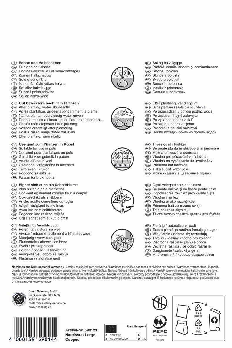 Die Pegasus Großkronige Narzisse „California“ (Narcissus) im Big Bag begeistern durch ihre leuchtend gelben Blüten, die sofort Frühlingsstimmung verbreiten. Diese beeindruckenden Narzissen gedeihen sowohl in sonnigen als auch in halbschattigen Lagen und passen sich jedem normalen Gartenboden hervorragend an. Mit einer Wuchshöhe von etwa 40 cm blüht „California“ im März und April und bringt leuchtende Farbtupfer in den Garten. Besonders eindrucksvoll wirkt die Narzisse „California“, wenn sie in Gruppen gepflanzt wird. Ihre strahlenden Blüten sind nicht nur optisch ein Highlight, sondern eignen sich auch hervorragend als Schnittblumen, um Innenräume zu verschönern. Zudem ist diese Narzisse ideal für die Bepflanzung von Kübeln und Kästen und bringt somit auch auf Balkone und Terrassen ihre fröhlichen Farbakzente. Diese pflegeleichte und vielseitige Pflanze ist eine wunderbare Ergänzung, di den Frühling willkommen heißt.| Kurzbezeichnung : | Pegasus Aktion Narzisse California |