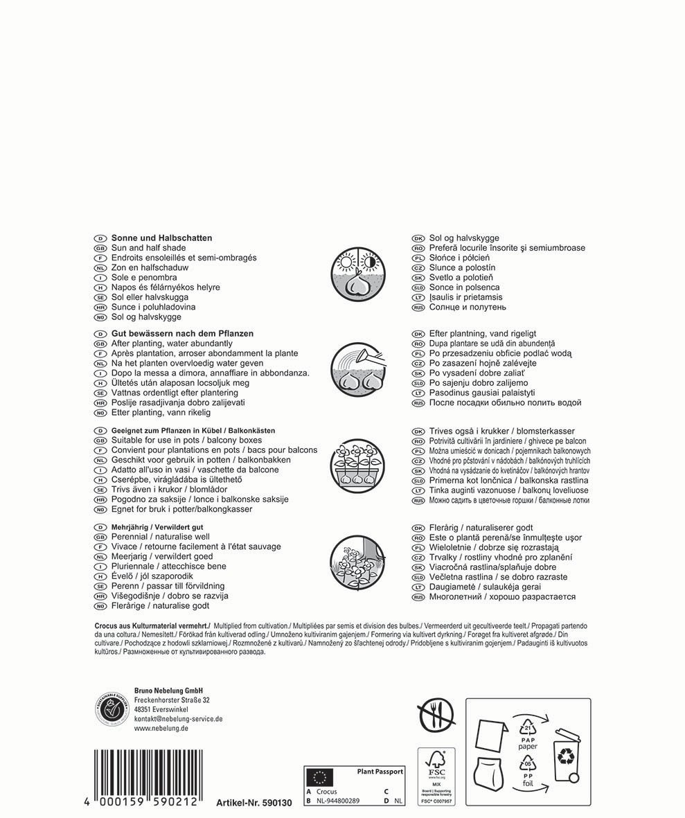 Die Pegasus Botanische Krokus-Mischung (Crocus chrysanthus) im Big Bag begeistert jedes Jahr aufs Neue mit einer farbenfrohen Blütenpracht. Diese robusten, verwildernden Krokusse trotzen selbst Minustemperaturen, da ihre Zellen als natürlicher Frostschutz Zucker einlagern können. Für die Pflanzung in Kübeln oder anderen Behältern sollte Folgendes beachtet werden: Nach dem Einsetzen der Blumenzwiebeln ist ein gründliches Angießen wichtig. Das Pflanzgefäß sollte anschließend an einem geschützten Ort, wie einer Hauswand, in einer kalten Garage oder unter Sträuchern im Garten überwintern. Ab Mitte bis Ende März können die Gefäße aus dem Winterquartier geholt und ins volle Licht gestellt werden. Eine Kühlphase ist unerlässlich, damit die Zwiebeln blühfähige Blüten entwickeln können. Bei Temperaturen unter -10 °C ist ein zusätzlicher Winterschutz ratsam. Die Pflanzung erfolgt im Herbst bis Dezember, und bereits ab Februar bis März erscheinen die ersten Blüten. Diese Krokusse bieten nicht nur eine hervorragende Möglichkeit, den Frühling frühzeitig willkommen zu heißen und farbenfrohe Akzente im Garten zu setzen, sondern sie unterstützen auch nützliche Insekten wie Bienen, die sich an den frühen Blüten erfreuen können.| Kurzbezeichnung : | Pegasus BigBag Botanische Krokus Mischung |
