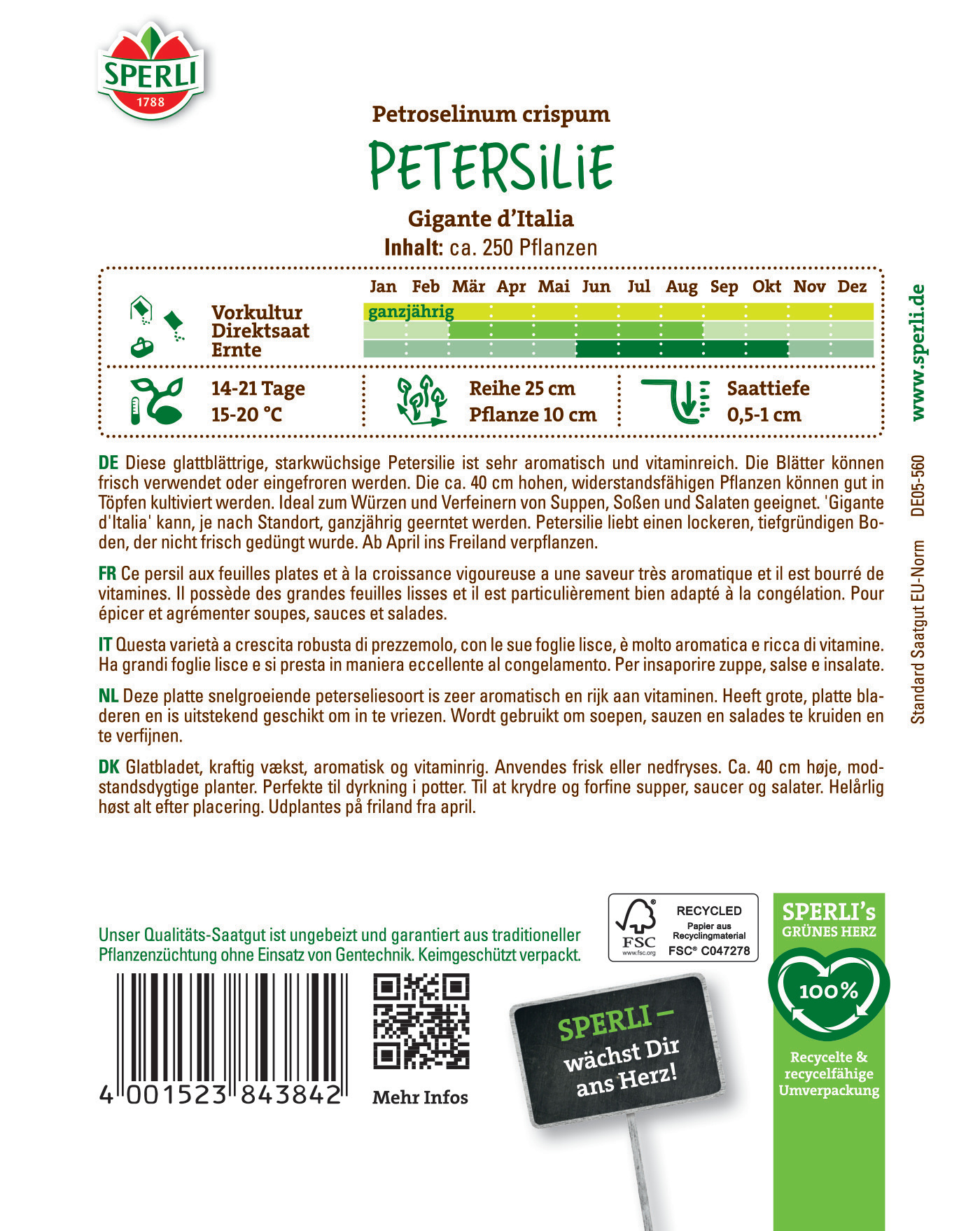 Eine sehr wüchsige Premiumsorte stellt die zweijährige Petersilie 'Gigante d'Italia' dar. Nach der Aussaat, die im Haus von Februar bis September im Freiland von März bis August möglich ist, bildet sie schnell sehr glatte, großflächige Blätter. Diese kannst Du im Zeitraum von Mai bis Oktober ernten und zum Würzen von Soßen, Suppen oder Salaten nutzen