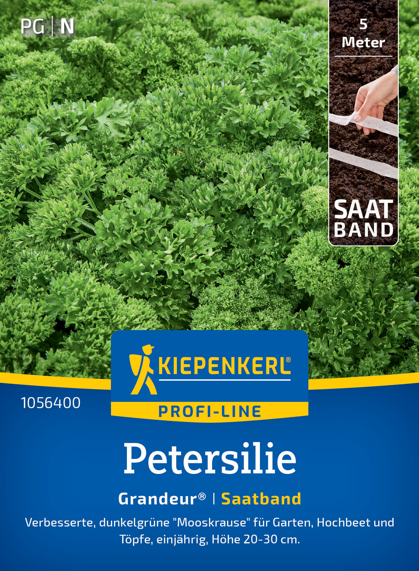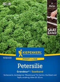 Die Petersilie 'Grandeur®' überzeugt durch ihren kompakten Wuchs und die dunkelgrünen, dicht gekrausten Blätter. Mit einer Höhe von 20-30 cm ist diese einjährige Sorte ideal für Gärten, Hochbeete und Töpfe. Sie bereichert Ihre Küche mit ihrem intensiven Aroma, das frisch am besten zur Geltung kommt. Nutzen Sie die Möglichkeit, die Petersilie direkt vor Ihrer Haustür anzubauen und erleben Sie das Vergnügen, jederzeit frische Blätter zu ernten. Perfekt geeignet auch für die Zubereitung von Pesto oder zum portionierten Einfrieren. Genießen Sie die vielseitigen Verwendungsmöglichkeiten, die diese Petersilie in Ihre Küche bringt. Freuen Sie sich auf Ihre eigenen Ernten mit der Petersilie 'Grandeur®'!| Kurzbezeichnung : | Petersilie Grandeur®, Saatband |