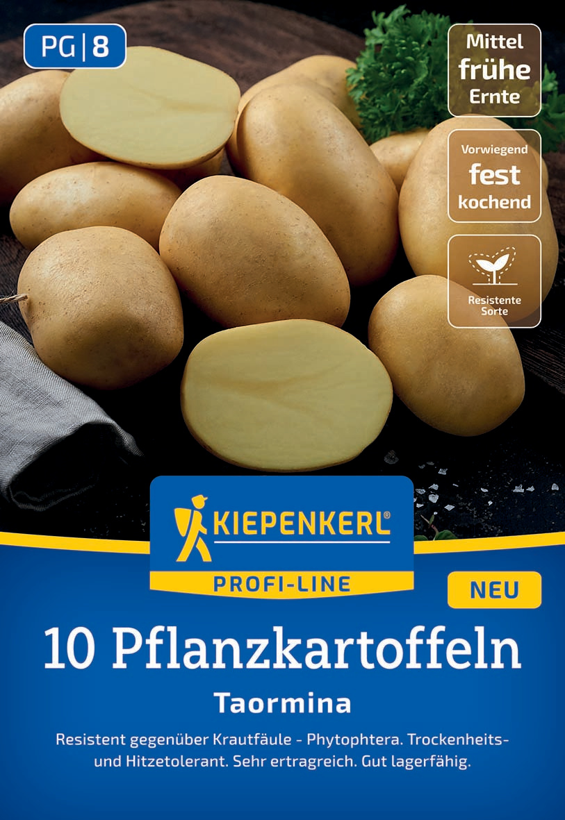 Die Sorte 'Taormina' ist eine vorwiegend festkochende Kartoffelsorte mit gelber Schale und gelbem Fleisch, die sich durch ihren feinen, nussigen Geschmack auszeichnet. Als Neuzüchtung hat sie herausragende Sorteneigenschaften, weshalb sie zum Profi-Line-Sortiment von Kiepenkerl gehört. 'Taormina' zeichnet sich durch ihre hohe Resistenz gegenüber Phytophthora, Kraut- und Braunfäule, sowie eine hohe Resistenz gegenüber Nematoden und Kartoffelkrebs aus. Zudem besitzt sie eine hohe Trockenheits- und Hitzetoleranz, wodurch sie sich gut an die sich verändernden Witterungsbedingungen anpasst.