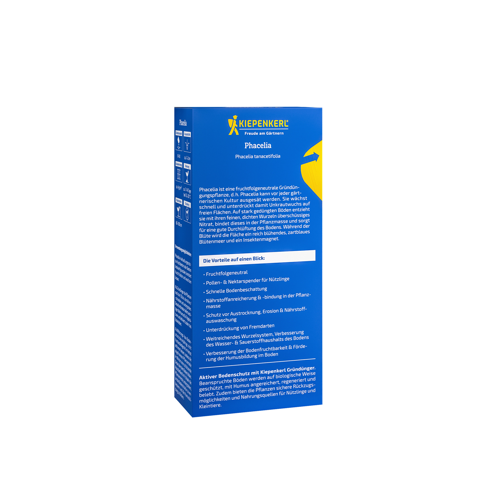 Phacelia ist eine äußerst nützliche Gründüngungspflanze, die fruchtfolgeneutral ist. Das bedeutet, dass Sie Phacelia vor jeder gärtnerischen Kultur aussäen können, ohne den Boden negativ zu beeinflussen. Sie wächst schnell und unterdrückt damit effektiv den Unkrautwuchs auf freien Flächen. Besonders auf stark gedüngten Böden zeigt Phacelia ihre Stärken: Mit ihren feinen, dichten Wurzeln entzieht sie überschüssiges Nitrat, bindet es in der Pflanzmasse und sorgt für eine gute Durchlüftung des Bodens. Während der Blüte verwandelt sich die Fläche in ein prachtvolles, zartblaues Blütenmeer und zieht zahlreiche Insekten an.