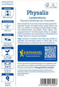 Die Lampionblume ist eine wahre Augenweide mit ihren auffälligen, orangefarbenen Früchten! Diese mehrjährige Pflanze erreicht eine Höhe von 60 bis 100 cm und bringt eine fröhliche Note in Ihren Garten. Entdecken Sie die farbenfrohe Lampionblume und erfahren Sie, wie sie Ihre Gartenlandschaft zum Leuchten bringt! Ihre leuchtenden Früchte sind nicht nur schön anzusehen, sondern eignen sich auch hervorragend für Trockensträuße, die jedem Arrangement einen Hauch von Eleganz verleihen. Lassen Sie sich von der einzigartigen Schönheit der Lampionblume inspirieren und gestalten Sie Ihr Zuhause mit einem Stück Natur, das nicht nur begeistert, sondern auch lange Freude bereitet! Lassen Sie die Lampionblume in Ihren Garten einziehen und genießen Sie die faszinierende Blütenpracht!| Kurzbezeichnung : | Physalis Lampionblume |