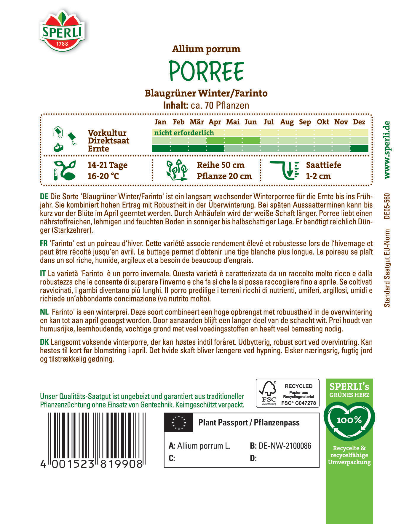 | Kurzbezeichnung : | Porree Blaugrüner Winter/Farinto |