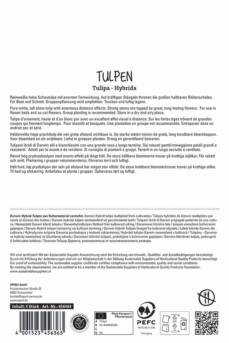 Die reinweißen Blüten der Darwin-Hybrid-Tulpe 'Hakuun' von SPERLI bestechen durch ihre beeindruckende Fernwirkung. Diese Tulpe zeichnet sich nicht nur durch ihre Eleganz, sondern auch durch ihre hohe Qualität aus. Die kräftigen Stiele tragen große, langlebige Blüten, die von April bis Mai auch als Schnittblumen hervorragend zur Geltung kommen. Mit einer Höhe von etwa 50 cm verwandelt 'Hakuun' Deinen Hausgarten in eine Wohlfühloase. Für eine optimale Pflege solltest Du die Blumenzwiebeln trocken und luftig aufbewahren und sie im Herbst an sonnigen oder halbschattigen Standorten in Gruppen pflanzen.| Kurzbezeichnung : | Premium Darwin-Hybrid-Tulpe Hakuun |