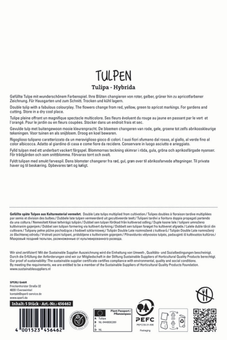 Im Frühling überrascht die Gefüllte Späte Tulpe 'Gudoshnik Double' von SPERLI mit ihren gefüllten Blüten und einer faszinierenden Farbvielfalt. Mit einer Kombination aus Rot, Gelb, Grün und Apricot setzen ihre Blüten lebendige Akzente. Ob im Blumenbeet oder in der Vase, der Blütenflor dieser 50 bis 60 cm hohen Tulpen wird Dich überwältigen! Damit die Anzucht der Blumenzwiebeln sicher gelingt, solltest Du sie von September bis Dezember an einem sonnigen oder halbschattigen Standort pflanzen. Vor allem in Gruppen entfalten die mehrjährigen und winterharten Naturschönheiten ihre volle Wirkung.| Kurzbezeichnung : | Premium Gefüllte Späte Tulpe Gudoshnik Double |
