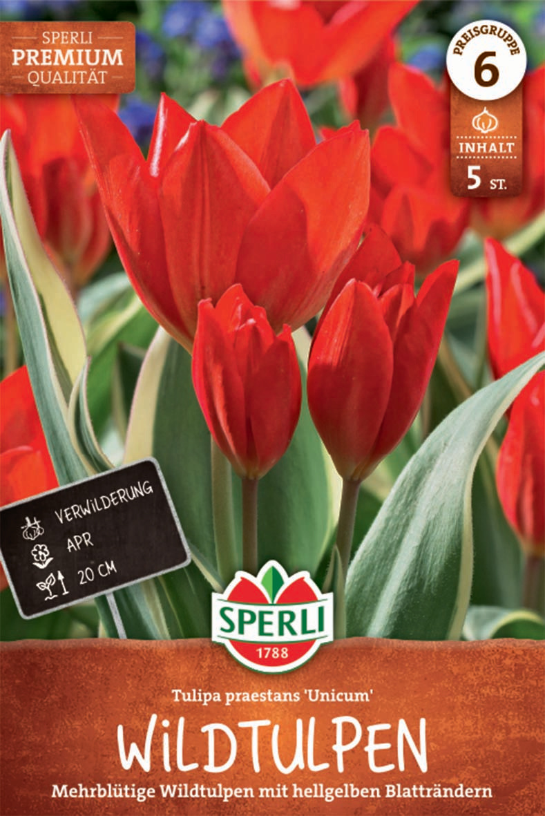 Die mehrblütige Wildtulpe 'Unicum' von SPERLI besticht durch ihre wunderschönen Blüten in romantischem Rot, deren Leuchtkraft durch das Grün der Blätter zusätzlich erhöht wird. Die verblüffend gelben Blattränder verleihen den Tulpen ein elegantes Flair und sind ein weiterer interessanter Blickfang. An Beeträndern gefällt uns die 20 cm hohe 'Unicum' besonders gut, doch auch in Kästen, Kübeln oder im Freien verwildernd wird sie Dein grünes Herz höherschlagen lassen!