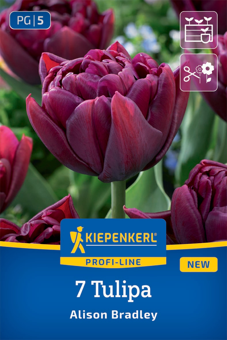 Mit der Kiepenkerl Profi-Line Tulpe `Alison Bradley` holen Sie sich eine besonders elegante Frühlingsblume in Ihren Garten oder auf den Balkon. Die stark gefüllten Blüten in Purpur bis Lila mit rotvioletten Nuancen erinnern an edle Pfingstrosen, blühen aber deutlich früher – bereits im April. Durch die niedrige Wuchshöhe von etwa 30 Zentimetern eignet sich diese Sorte hervorragend für Töpfe, Balkonkästen, Hochbeete und kleine Beete.