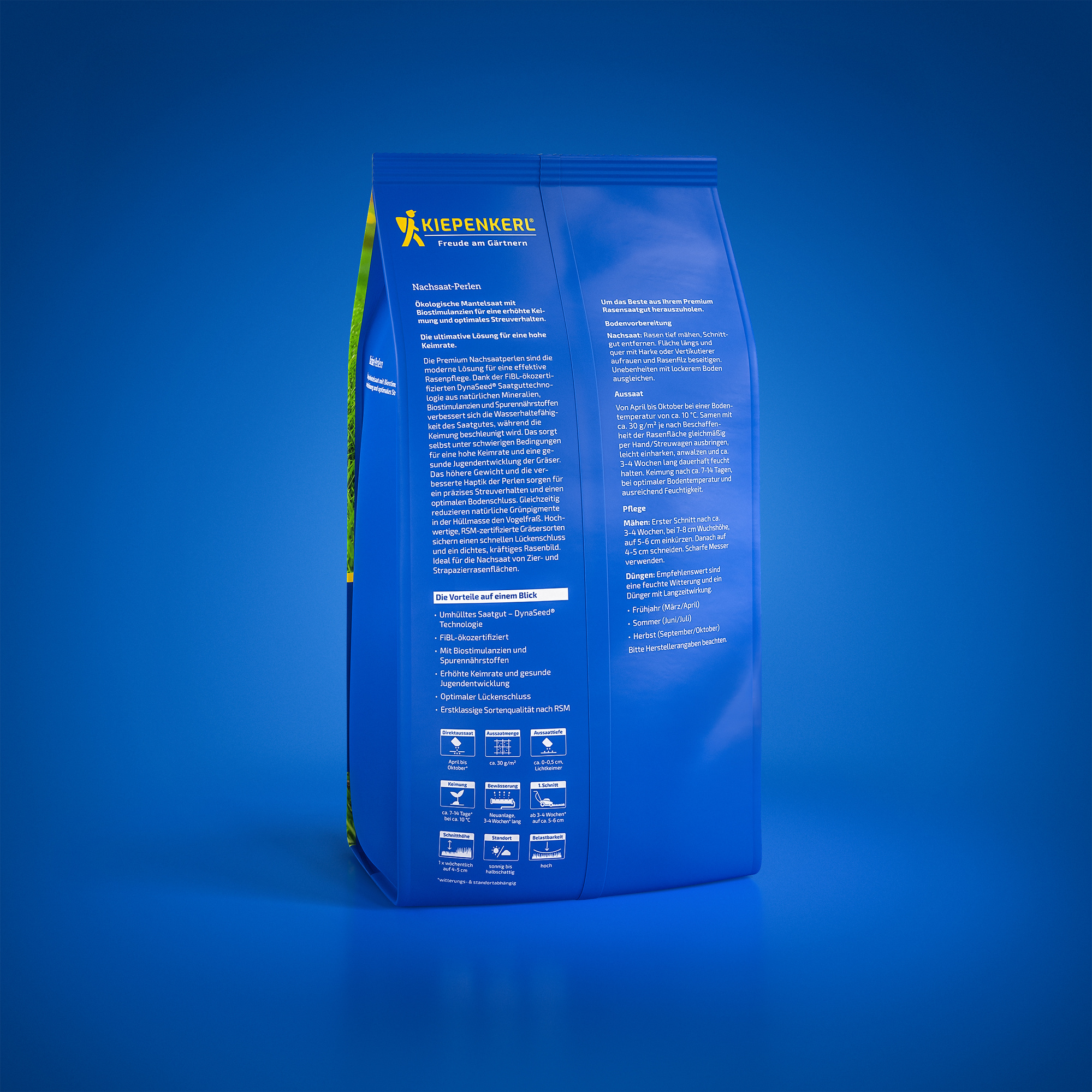 Die Premium Nachsaatperlen sind die moderne Lösung für eine effektive Rasenpflege. Dank der FiBL-ökozertifizierten DynaSeed® Saatguttechnologie aus natürlichen Mineralien, Biostimulanzien und Spurennährstoffen verbessert sich die Wasserhaltefähigkeit des Saatgutes, während die Keimung beschleunigt wird. Das sorgt selbst unter schwierigen Bedingungen für eine hohe Keimrate und eine gesunde Jugendentwicklung der Gräser. Das höhere Gewicht und die verbesserte Haptik der Perlen sorgen für ein präzises Streuverhalten und einen optimalen Bodenschluss. Gleichzeitig reduzieren natürliche Grünpigmente in der Hüllmasse den Vogelfraß. Hochwertige, RSM-zertifizierte Gräsersorten sichern einen schnellen Lückenschluss und ein dichtes, kräftiges Rasenbild.