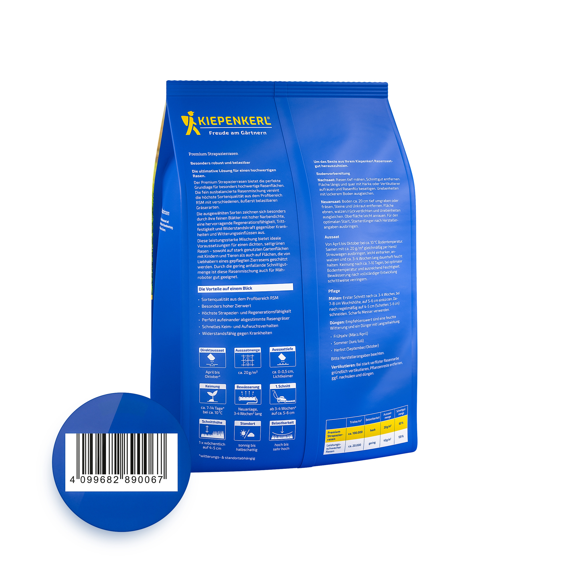 Die speziell ausgewählten Gräserarten zeichnen sich durch hervorragende Regenerationsfähigkeit, hohe Trittfestigkeit und eine starke Widerstandskraft gegenüber Krankheiten und Witterung aus. Auch bei intensiver Nutzung bleibt der Rasen dauerhaft sattgrün, dicht und robust. Dank der geringen Schnittgutmenge ist diese Mischung zudem optimal für Mähroboter geeignet.
