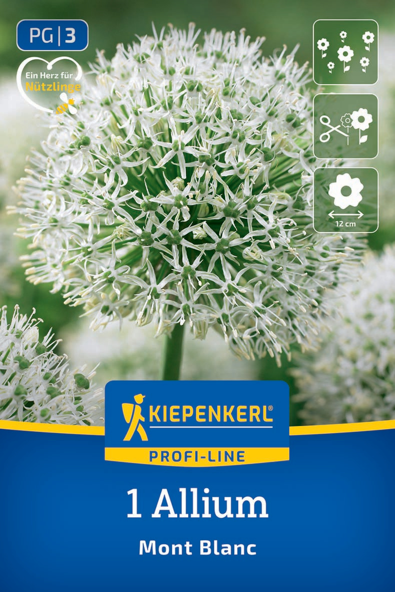 Beim Allium 'Mont Blanc' handelt es sich um einen Riesen-Zierlauch aus dem Kiepenkerl-Blumenzwiebelsortiment, der eine Wuchshöhe von bis zu 100 cm erreicht. Highlight sind jedoch seine schneeweißen Blütenbälle. Sie bestehen aus unzähligen kleinen Einzelblüten und sind eine willkommene Nahrungsquelle für Bienen, Schmetterlinge, Hummeln und andere Nützlinge.