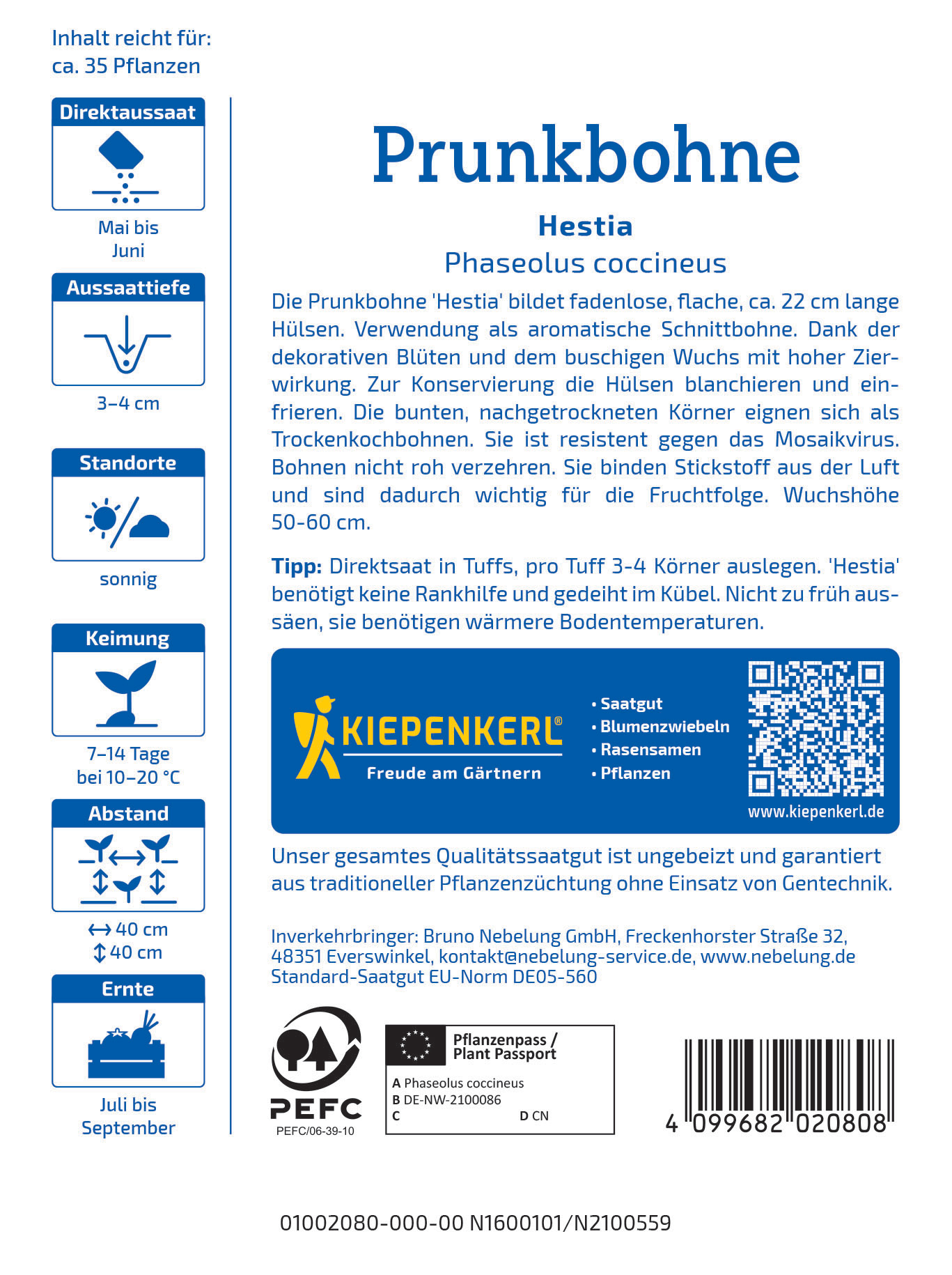 Die Prunkbohne 'Hestia' besticht durch ihre fadenlosen, flachen Hülsen mit einer Länge von ca. 22 cm. Ihre wohlschmeckenden Bohnen sind nicht nur ein Fest für den Gaumen, sondern auch optisch ansprechend dank der bunten Blüten, die sie zieren. Mit einer Höhe von 50-60 cm eignet sich diese Sorte perfekt für kleinere Gärten oder Hochbeete. Die schmackhaften Hülsen sind ideal zum Blanchieren und Einfrieren, und die bunten, nachgetrockneten Körner sind vielseitig als Trockenkochbohnen einsetzbar. Entdecken Sie die Gartenfreude mit der Prunkbohne 'Hestia' und genießen Sie reiche Erträge, die Ihr kulinarisches Erlebnis bereichern. Lassen Sie sich von der Vielfalt Ihres Gartens inspirieren!| Kurzbezeichnung : | Prunkbohne Hestia |