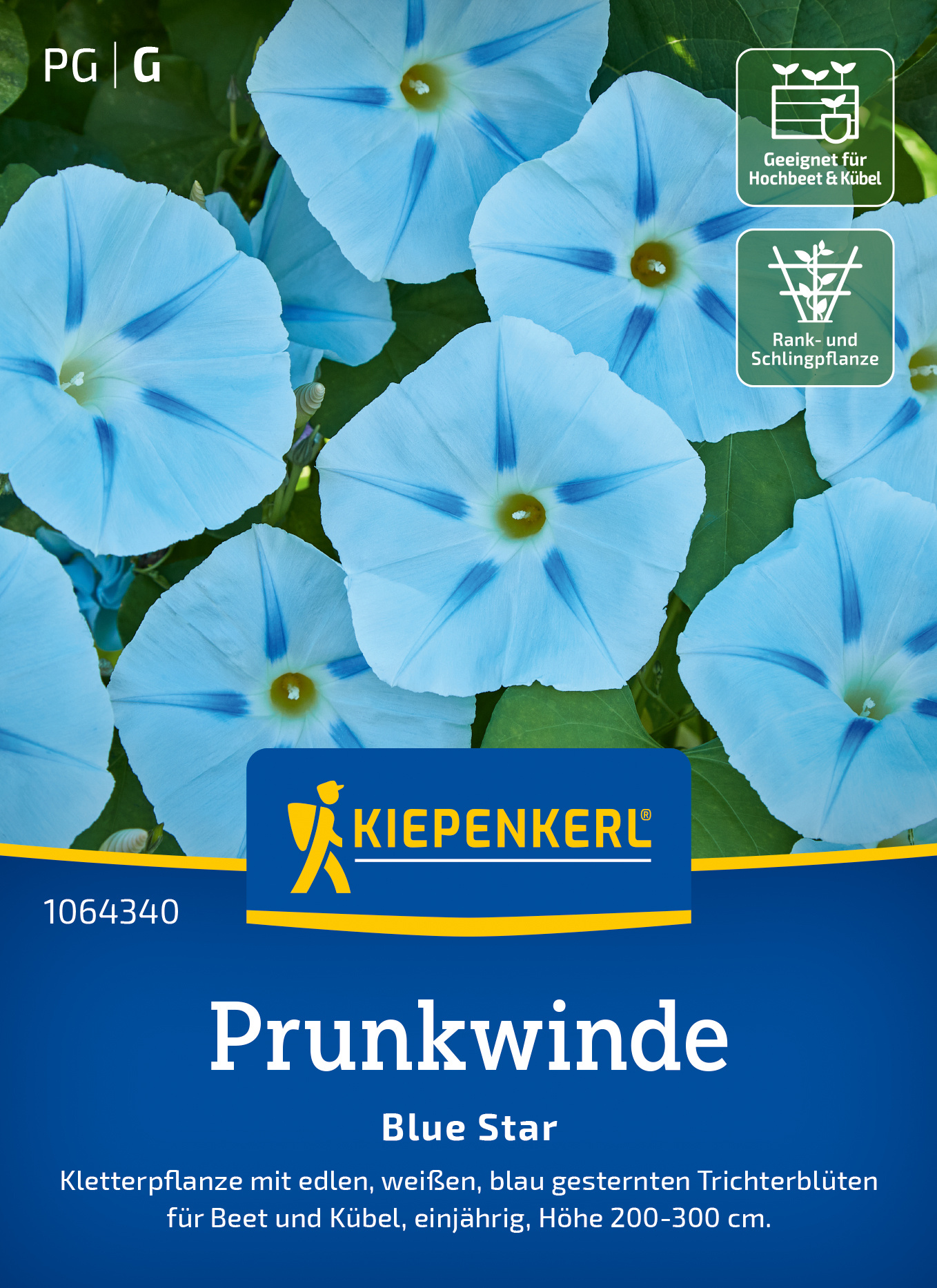 Die Prunkwinde 'Blue Star' verzaubert mit ihren großen, weißen Trichterblüten, die von einem auffälligen dunkelblauen Stern im Zentrum geschmückt werden. Diese einjährige Kletterpflanze bringt rasch Leben an Zäune oder Rankhilfen, indem sie laufend neue Blüten bildet. Sie ist nicht nur ein Blickfang, sondern anpassungsfähig und gedeiht problemlos im Beet oder Kübel. Mit ihrer eleganten Erscheinung sorgt die 'Blue Star' für ein ansprechendes Gesamtbild in jedem Garten. Ihre Fähigkeit, schnell zu wachsen und kontinuierlich zu blühen, macht diese Pflanze zur idealen Wahl für alle, die ihren Garten mit wenig Aufwand verschönern möchten. Beachten Sie bitte, dass der Verzehr gesundheitliche Komplikationen verursachen kann. Setzen Sie mit der Prunkwinde 'Blue Star' blühende Akzente!| Kurzbezeichnung : | Prunkwinde Blue Star |