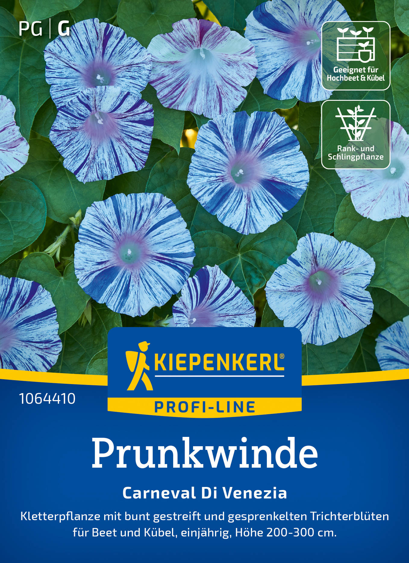 Die Prunkwinde 'Carneval di Venezia' fasziniert mit ihren beeindruckenden, bunt gestreiften und gesprenkelten Trichterblüten. Diese Kletterpflanze blüht im Laufe des Tages und überzeugt durch ihre lebendigen Farben, die jeden Garten oder Kübel aufpeppen. Sie ist perfekt, um Wände oder Zäune im Handumdrehen zu begrünen. Mit ihrer Fähigkeit laufend neue Blüten zu bilden, bringt die 'Carneval di Venezia' lebendige Akzente in Ihren Außenbereich. Erfreuen Sie sich an ihrer Schönheit und der Anziehungskraft für Insekten. Beachten Sie bitte, dass der Verzehr gesundheitliche Komplikationen verursachen kann. Bringen Sie mit der Prunkwinde 'Carneval di Venezia' farbenfrohe Stimmung in Ihren Garten!| Kurzbezeichnung : | Prunkwinde Carneval Di Venezia Mischung |