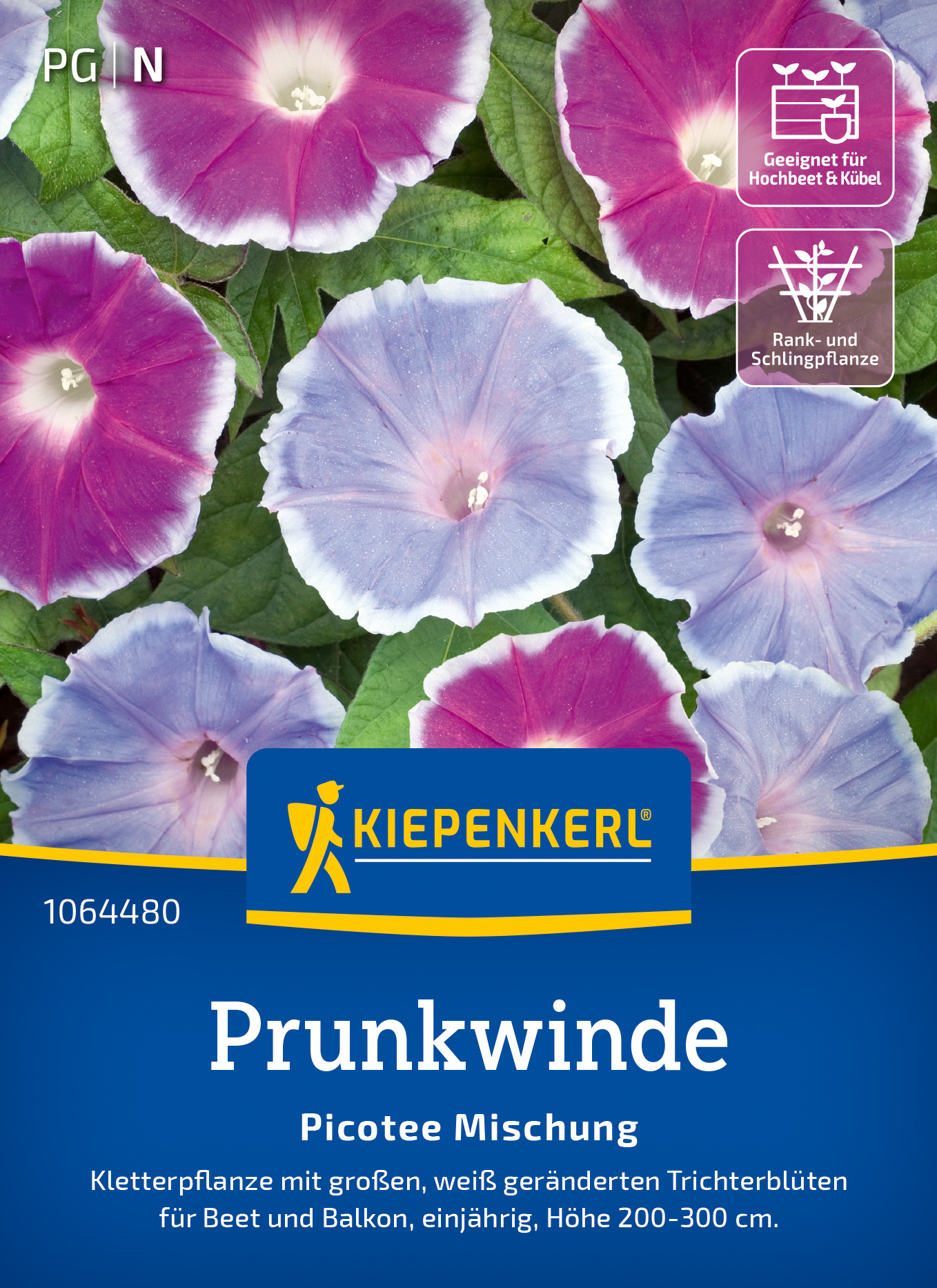 Die Prunkwinde Picotee Mischung begeistert mit ihren attraktiven, großen Trichterblüten in Pink und Violett, die einen weißen Rand zieren. Diese Kletterpflanze ist perfekt dafür geeignet, Zäune und Kübel in kürzester Zeit zu begrünen. Ihre fortwährende Blüte sorgt für ein fröhliches Blütenmeer in jedem Garten. Die faszinierenden Blüten und das üppige Wachstum spiegeln die Lebhaftigkeit dieser einjährigen Pflanze wider. Genießen Sie die Farbenpracht und das Gefühl, mit dieser dekorativen Kletterpflanze ein blühendes Paradies zu schaffen. Achtung: Der Verzehr kann gesundheitliche Komplikationen auslösen. Gestalten Sie Ihren Garten mit der Prunkwinde Picotee Mischung bunt und lebendig!| Kurzbezeichnung : | Prunkwinde Picotee Mix |