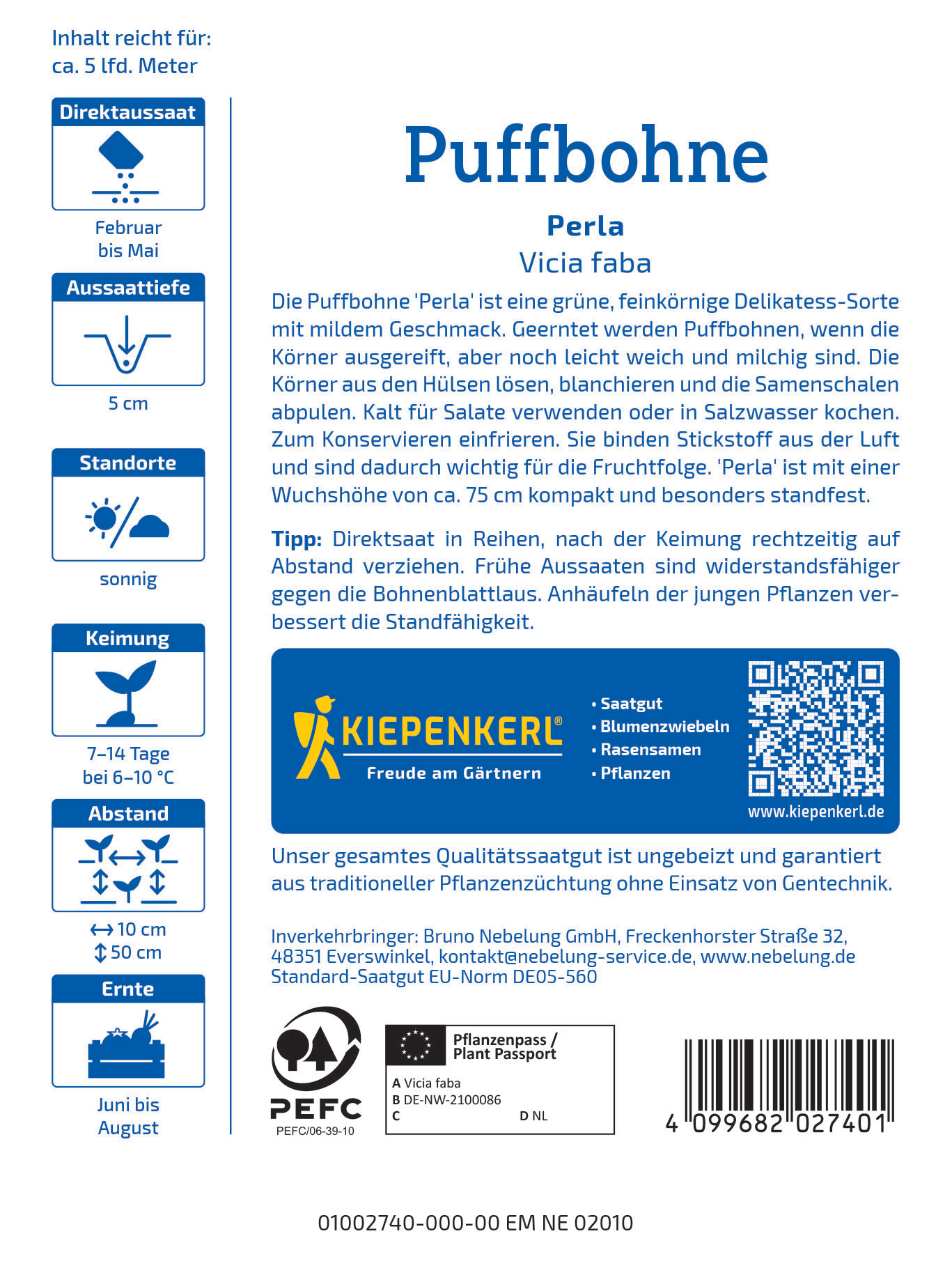 Die Puffbohne 'Perla' ist feinkörnig und weist einen milden Geschmack auf, der jeden Gaumen erfreut. Mit einer Wuchshöhe von ca. 75 cm ist sie besonders standfest und eignet sich daher für jeden Garten. Ernten Sie die Bohnen, wenn sie ausgereift und leicht weich sind. Blanchieren Sie die Körner und genießen Sie sie frisch oder gefroren in verschiedenen Gerichten. Sie binden Stickstoff aus der Luft und sind dadurch wichtig für die Fruchtfolge. Erleben Sie die vielen Möglichkeiten, die die Puffbohne 'Perla' bietet, und lassen Sie Ihrer Kreativität im Garten freien Lauf. Ihre frischen Zutaten machen nicht nur Freude, sondern tragen auch zu einer gesunden Ernährung bei. Packen Sie mit uns Ihr Gartenprojekt an!| Kurzbezeichnung : | Puffbohne Perla |