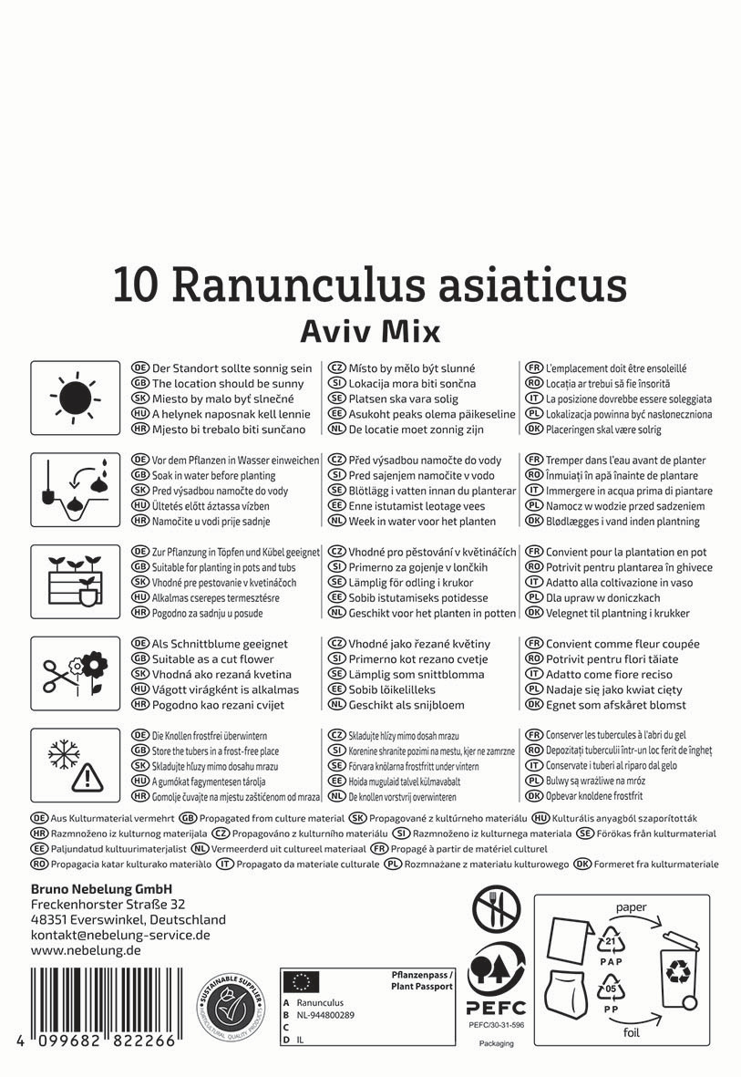 Tipp: Vor dem Pflanzen die Wurzelknollen für circa 4 - 6 Stunden in lauwarmes Wasser quellen lassen. Anschließend die Wurzelknollen mit den Krallen nach unten in die Erde setzen.