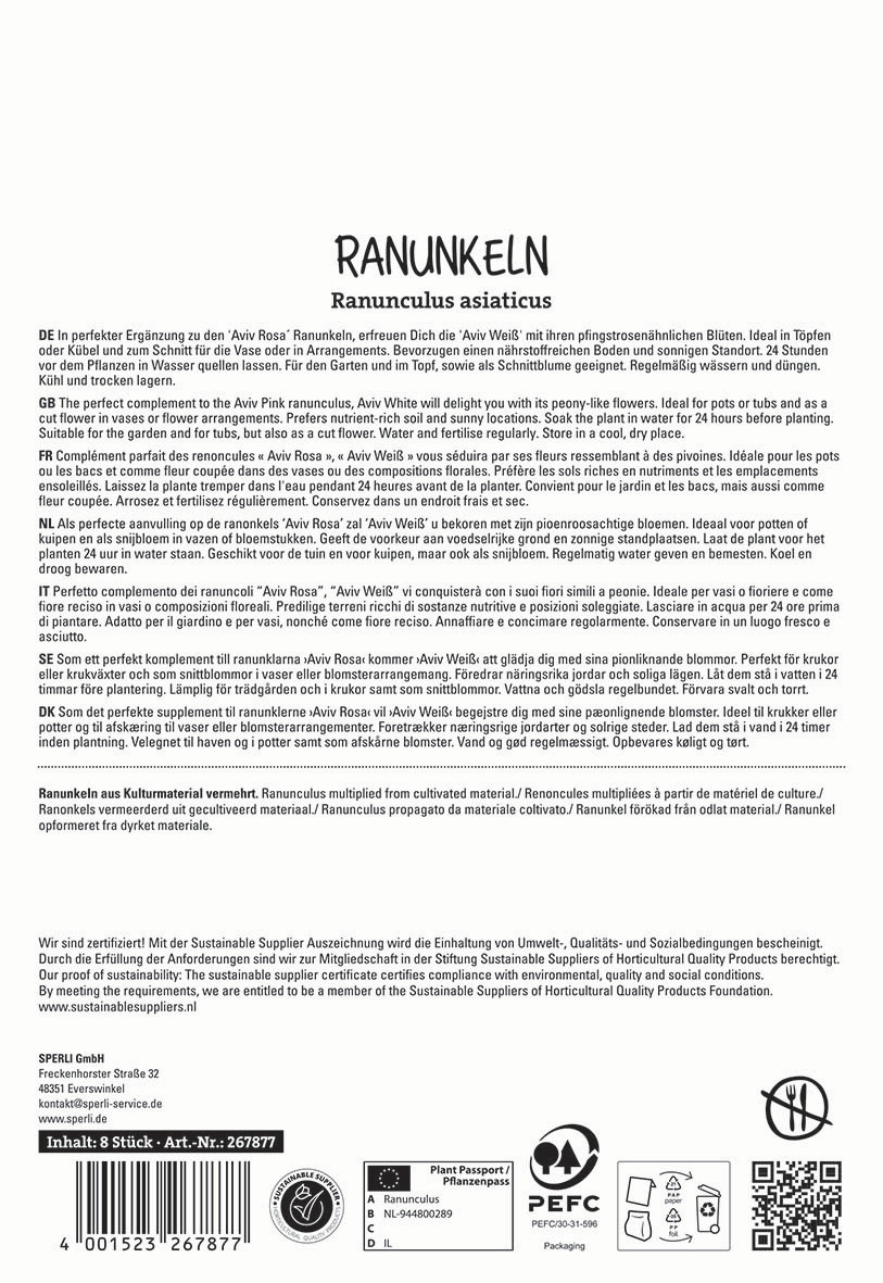 Die Ranunkel „Aviv Weiß“ präsentiert sich mit rahmweißen, dichtgefüllten Blüten. Sie erscheinen zahlreich im Frühling und erfreuen bis in den Frühsommer jeden Pflanzen-liebhaber mit ihrer seidigen Textur. Mit einer Wuchshöhe von circa 40 cm eignet sich die Sorte besonders gut für Kästen und Kübel auf Balkon und Terrasse. Die robusten Stiele machen „Aviv Weiß“ zu einer ausge-zeichneten, langlebigen Schnittblume. Die Ranunkelknollen werden im Frühjahr gepflanzt, sobald keine Frostgefahr mehr be-steht. Für ein gesundes Wachstum bevorzugt „Aviv Weiß“ einen sonnigen bis halbschat-tigen Standort mit gut durchlässigem, humosem Boden. Regelmäßige Wassergaben, wobei Staunässe unbedingt zu vermeiden ist, sowie eine ausgewogene Düngung unter-stützen die Blütenbildung und Vitalität der Pflanzen. Die Sorte zeichnet sich durch ihre Pflegeleichtigkeit und Widerstandsfähigkeit gegenüber gängigen Krankheiten aus. Mit der Ranunkel „Aviv Weiß“ erhältst Du eine hochwertige Neuheit, die durch ihre ele-gante Farbgebung und stabile Wuchsform überzeugt – ideal für Pflanzenliebhaber, die sich gerne Blumen für die Vase schneiden.| Kurzbezeichnung : | Ranunkeln Weiß |